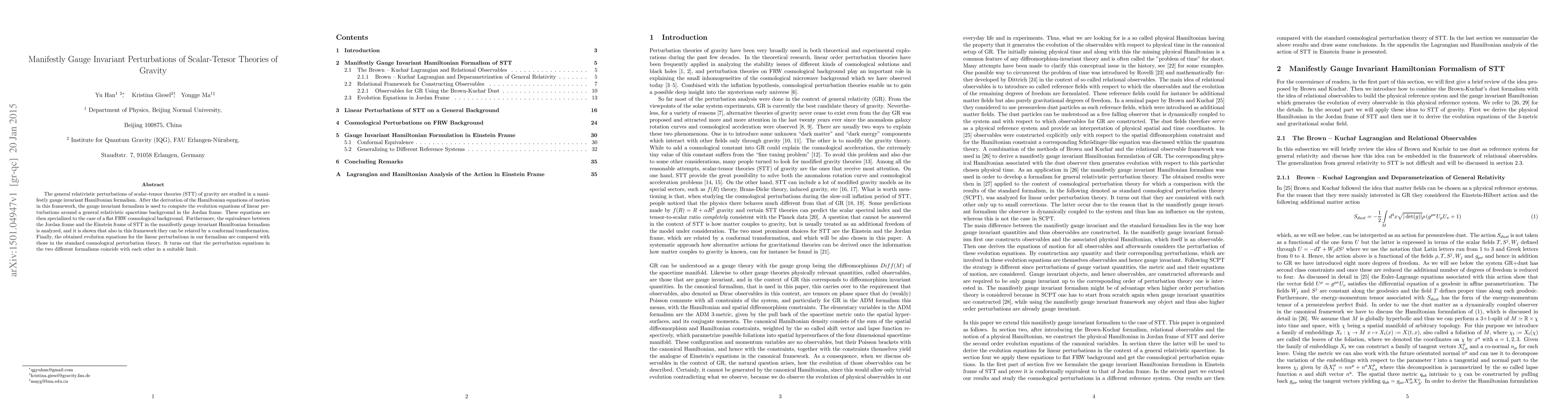 This paper investigates relativistic perturbations in scalar-tensor theories of gravity using a manifestly gauge invariant Hamiltonian formalism. It derives evolution equations for linear perturbations in a cosmological background and confirms the equivalence between Jordan and Einstein frames through a conformal transformation.