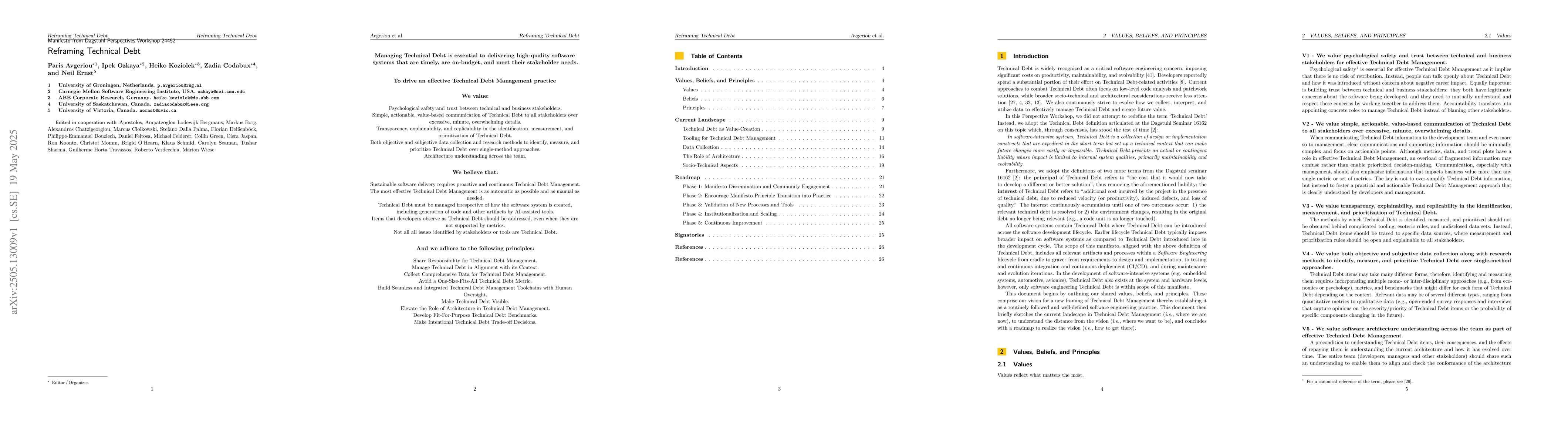 This work stands out by collectively reframing Technical Debt through a set of shared Values, Beliefs, and Principles, and by critiquing existing practices while proposing a roadmap for advancement, fostering collaboration among researchers, practitioners, and tool vendors.