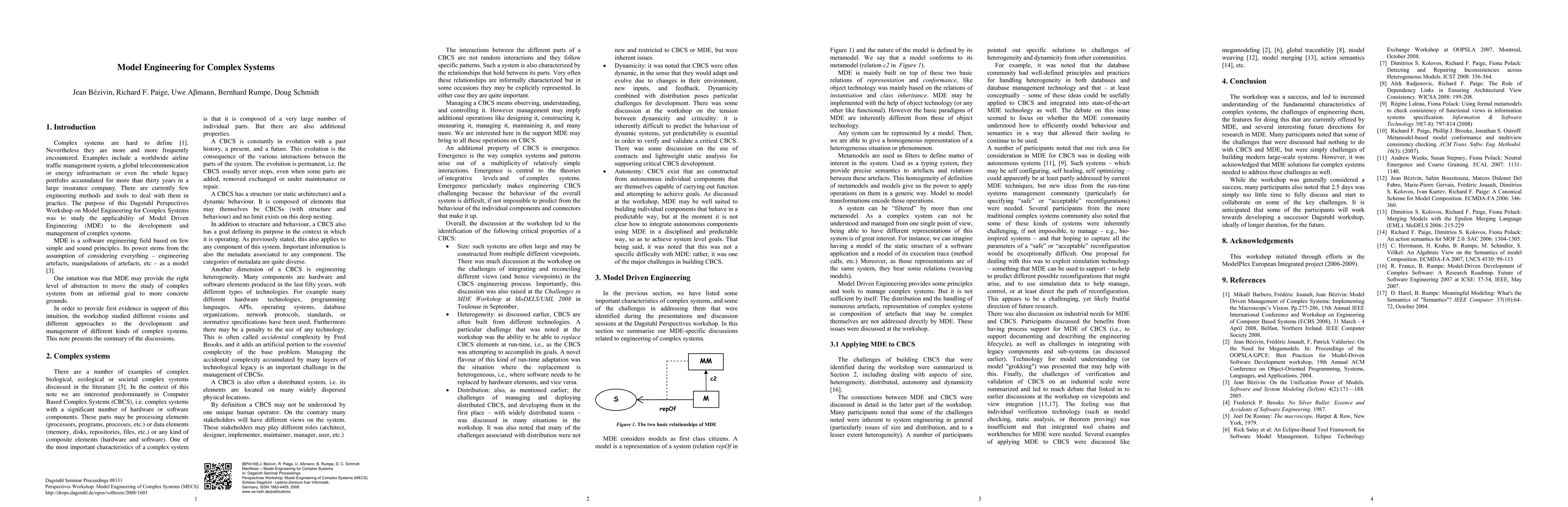 This paper summarizes discussions from a Dagstuhl workshop on applying Model Driven Engineering (MDE) to complex systems, suggesting that MDE's abstraction level may offer a practical approach to managing systems like airline traffic, telecommunications, and large insurance portfolios. The workshop explored various visions and methods for developing and managing complex systems using MDE principles.