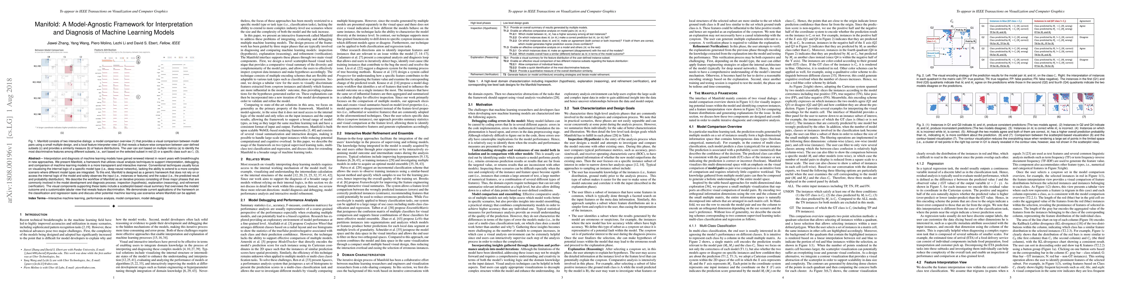 Manifold is a model-agnostic framework for interpreting and diagnosing machine learning models using visual analysis techniques. It facilitates an iterative process of inspection, explanation, and refinement without requiring access to the model's internal logic, thus supporting comparison across different model types.