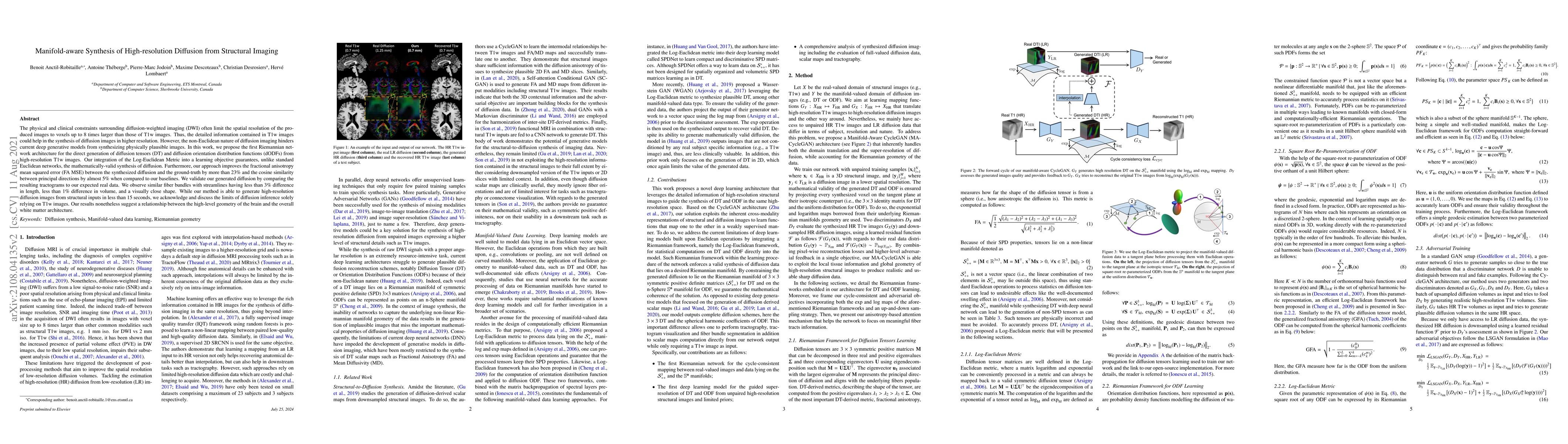 The physical and clinical constraints surrounding diffusion-weighted imaging (DWI) often limit the spatial resolution of the produced images to voxels up to 8 times larger than those of T1w images. Thus, the detailed information contained in T1w imagescould help in the synthesis of diffusion images in higher resolution. However, the non-Euclidean nature of diffusion imaging hinders current deep generative models from synthesizing physically plausible images. In this work, we propose the first Riemannian network architecture for the direct generation of diffusion tensors (DT) and diffusion orientation distribution functions (dODFs) from high-resolution T1w images. Our integration of the Log-Euclidean Metric into a learning objective guarantees, unlike standard Euclidean networks, the mathematically-valid synthesis of diffusion. Furthermore, our approach improves the fractional anisotropy mean squared error (FA MSE) between the synthesized diffusion and the ground-truth by more than 23% and the cosine similarity between principal directions by almost 5% when compared to our baselines. We validate our generated diffusion by comparing the resulting tractograms to our expected real data. We observe similar fiber bundles with streamlines having less than 3% difference in length, less than 1% difference in volume, and a visually close shape. While our method is able to generate high-resolution diffusion images from structural inputs in less than 15 seconds, we acknowledge and discuss the limits of diffusion inference solely relying on T1w images. Our results nonetheless suggest a relationship between the high-level geometry of the brain and the overall white matter architecture.