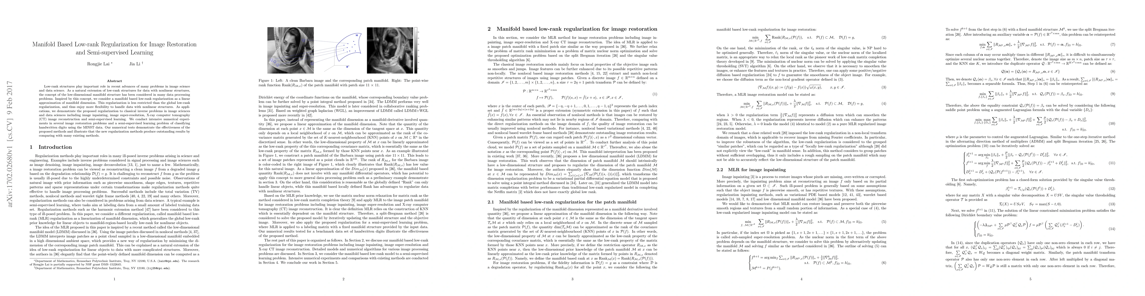 The paper proposes a manifold-based low-rank regularization method for image restoration and semi-supervised learning, extending low-rank structures to handle nonlinear data structures by approximating manifold dimensions linearly.