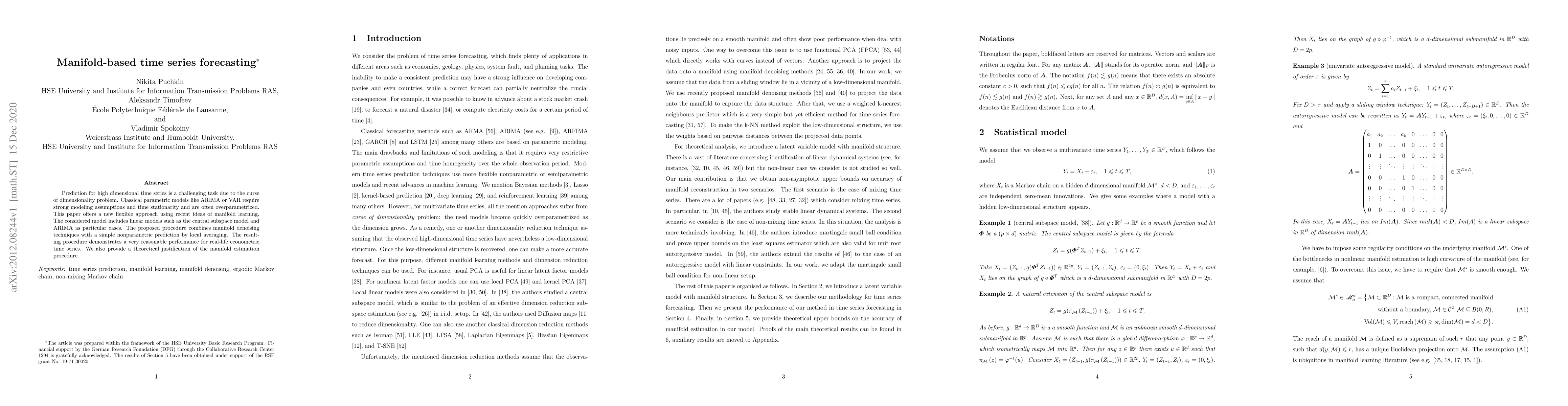 This paper introduces a novel manifold-based approach for high-dimensional time series forecasting, combining manifold denoising with local averaging for flexible, non-parametric predictions. The method outperforms classical parametric models and shows promising results on real-life econometric data.