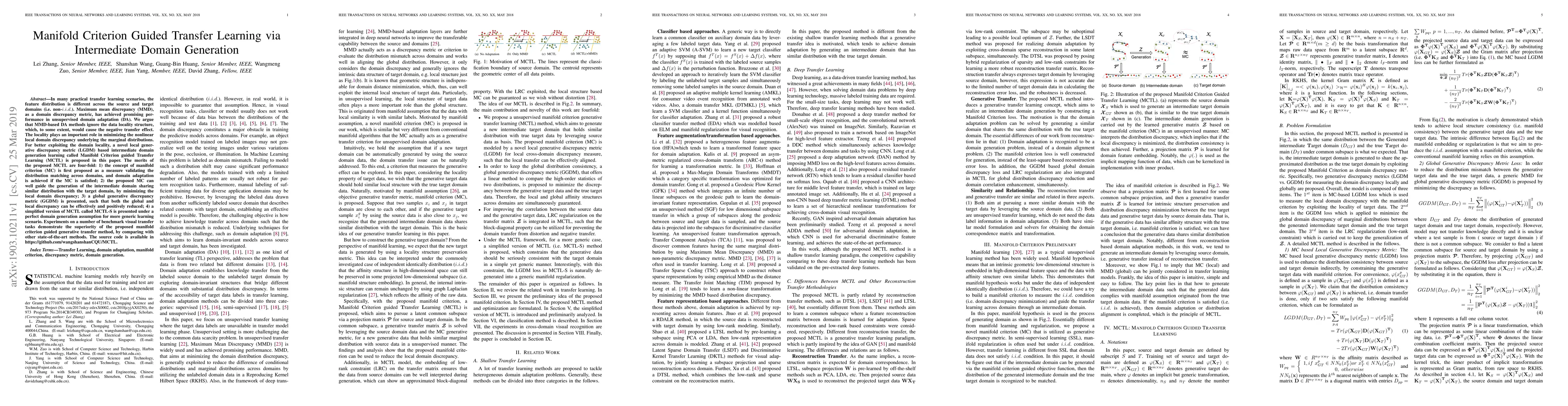 This paper proposes a novel Manifold Criterion guided Transfer Learning (MCTL) method that utilizes intermediate domain generation to address non-i.i.d. domain discrepancies in transfer learning. The method introduces a local generative discrepancy metric (LGDM) to minimize local domain discrepancies and effectively combines global and local discrepancy reduction for improved performance.