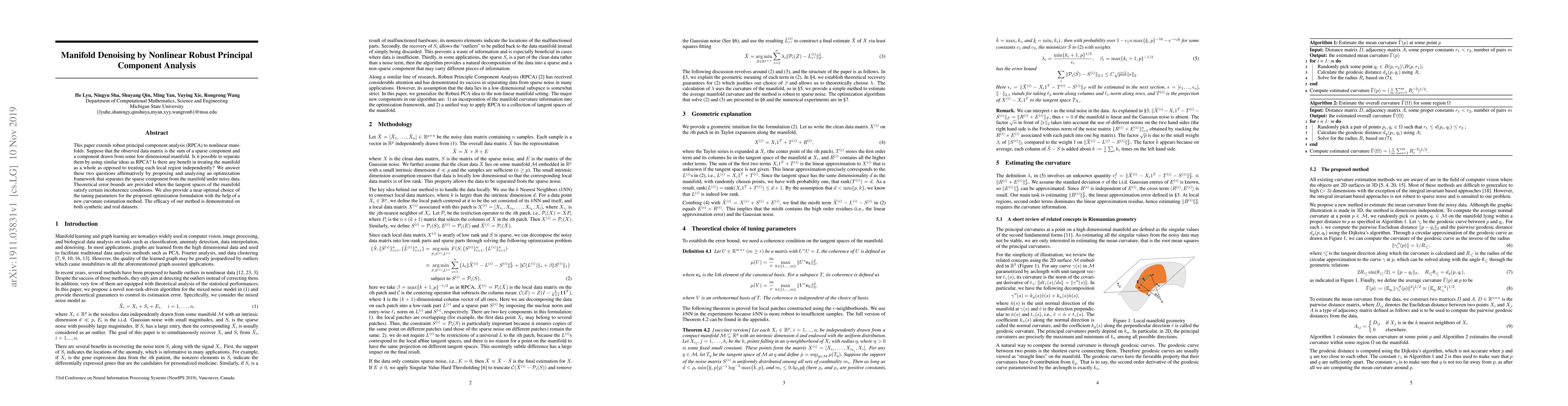This paper proposes a method to separate sparse components from nonlinear manifolds using robust principal component analysis, with a focus on minimizing errors under noisy data.