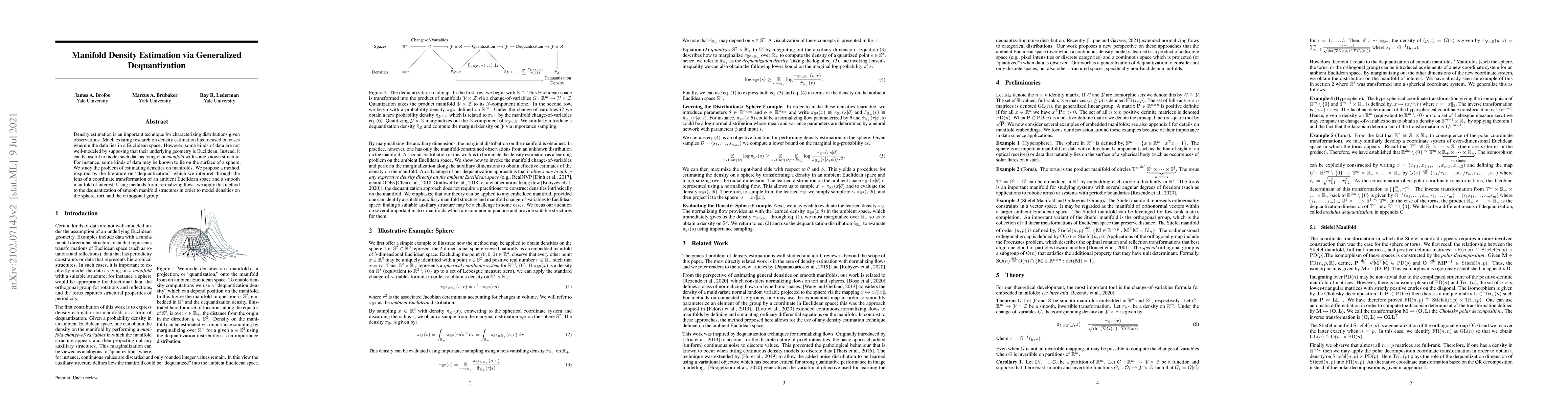Density estimation is an important technique for characterizing distributions given observations. Much existing research on density estimation has focused on cases wherein the data lies in a Euclidean space. However, some kinds of data are not well-modeled by supposing that their underlying geometry is Euclidean. Instead, it can be useful to model such data as lying on a {\it manifold} with some known structure. For instance, some kinds of data may be known to lie on the surface of a sphere. We study the problem of estimating densities on manifolds. We propose a method, inspired by the literature on "dequantization," which we interpret through the lens of a coordinate transformation of an ambient Euclidean space and a smooth manifold of interest. Using methods from normalizing flows, we apply this method to the dequantization of smooth manifold structures in order to model densities on the sphere, tori, and the orthogonal group.