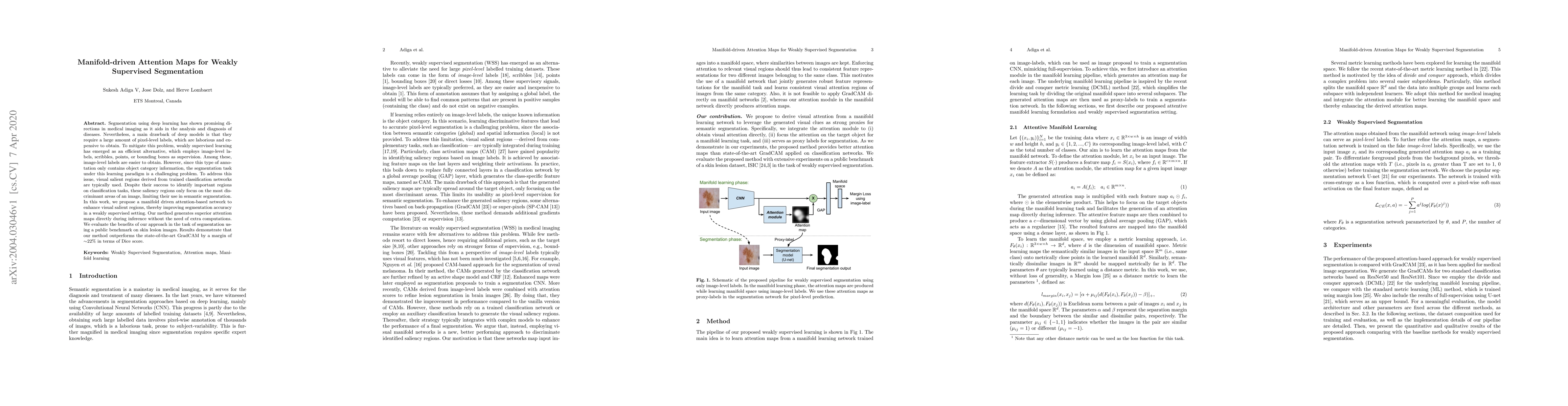Segmentation using deep learning has shown promising directions in medical imaging as it aids in the analysis and diagnosis of diseases. Nevertheless, a main drawback of deep models is that they require a large amount of pixel-level labels, which are laborious and expensive to obtain. To mitigate this problem, weakly supervised learning has emerged as an efficient alternative, which employs image-level labels, scribbles, points, or bounding boxes as supervision. Among these, image-level labels are easier to obtain. However, since this type of annotation only contains object category information, the segmentation task under this learning paradigm is a challenging problem. To address this issue, visual salient regions derived from trained classification networks are typically used. Despite their success to identify important regions on classification tasks, these saliency regions only focus on the most discriminant areas of an image, limiting their use in semantic segmentation. In this work, we propose a manifold driven attention-based network to enhance visual salient regions, thereby improving segmentation accuracy in a weakly supervised setting. Our method generates superior attention maps directly during inference without the need of extra computations. We evaluate the benefits of our approach in the task of segmentation using a public benchmark on skin lesion images. Results demonstrate that our method outperforms the state-of-the-art GradCAM by a margin of ~22% in terms of Dice score.
