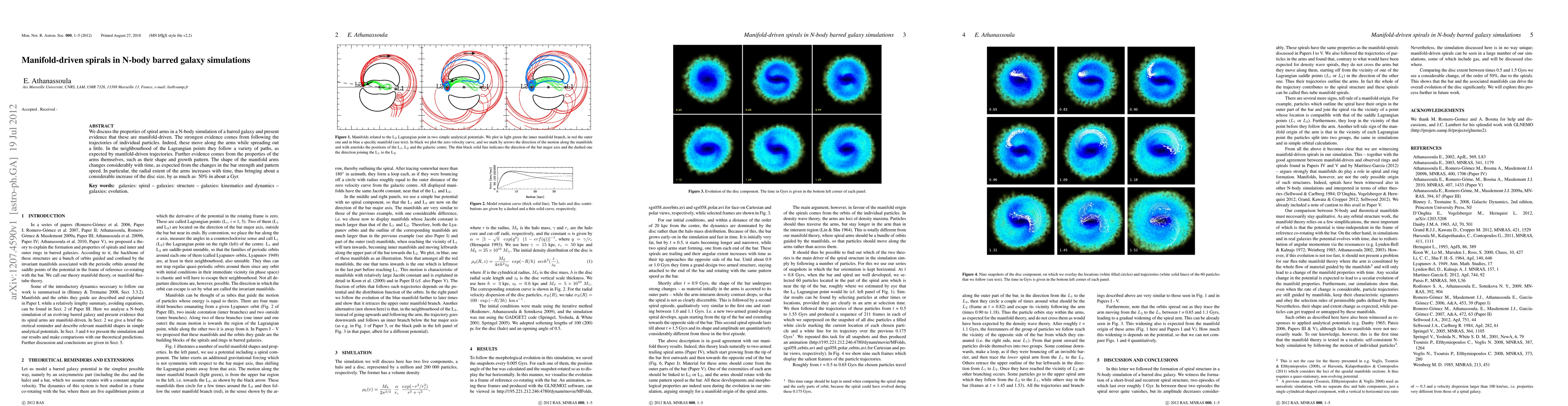 We discuss the properties of spiral arms in a N-body simulation of a barred galaxy and present evidence that these are manifold-driven. The strongest evidence comes from following the trajectories of individual particles. Indeed, these move along the arms while spreading out a little. In the neighbourhood of the Lagrangian points they follow a variety of paths, as expected by manifold-driven trajectories. Further evidence comes from the properties of the arms themselves, such as their shape and growth pattern. The shape of the manifold arms changes considerably with time, as expected from the changes in the bar strength and pattern speed. In particular, the radial extent of the arms increases with time, thus bringing about a considerable increase of the disc size, by as much as ~50% in about a Gyr.