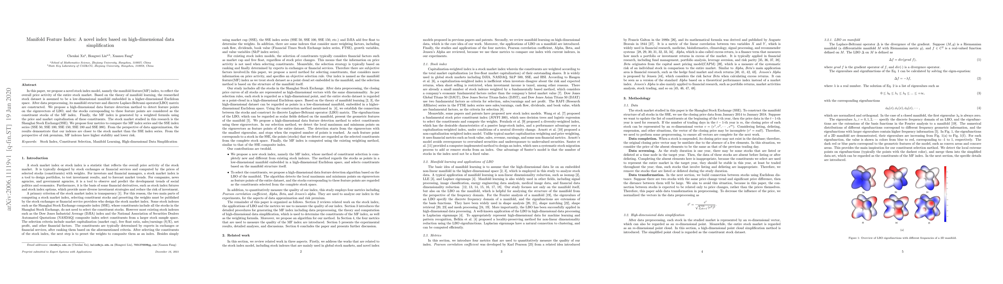 In this paper, we propose a novel stock index model, namely the manifold feature(MF) index, to reflect the overall price activity of the entire stock market. Based on the theory of manifold learning, the researched stock dataset is assumed to be a low-dimensional manifold embedded in a higher-dimensional Euclidean space. After data preprocessing, its manifold structure and discrete Laplace-Beltrami operator(LBO) matrix are constructed. We propose a high-dimensional data feature detection method to detect feature points on the eigenvectors of LBO, and the stocks corresponding to these feature points are considered as the constituent stocks of the MF index. Finally, the MF index is generated by a weighted formula using the price and market capitalization of these constituents. The stock market studied in this research is the Shanghai Stock Exchange(SSE). We propose four metrics to compare the MF index series and the SSE index series (SSE 50, SSE 100, SSE 150, SSE 180 and SSE 380). From the perspective of data approximation, the results demonstrate that our indexes are closer to the stock market than the SSE index series. From the perspective of risk premium, MF indexes have higher stability and lower risk.