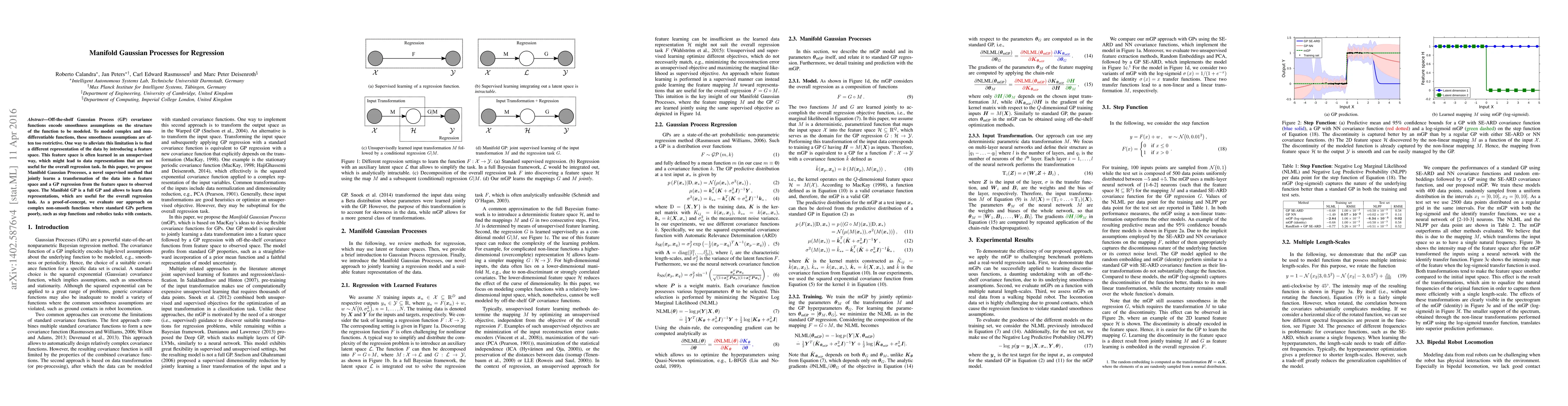 This paper introduces Manifold Gaussian Processes for regression, a supervised method that jointly learns a data transformation into a feature space and a Gaussian Process regression model, enabling it to handle complex, non-differentiable functions better than standard GPs. The approach is evaluated on step functions and robotics tasks, demonstrating improved performance.