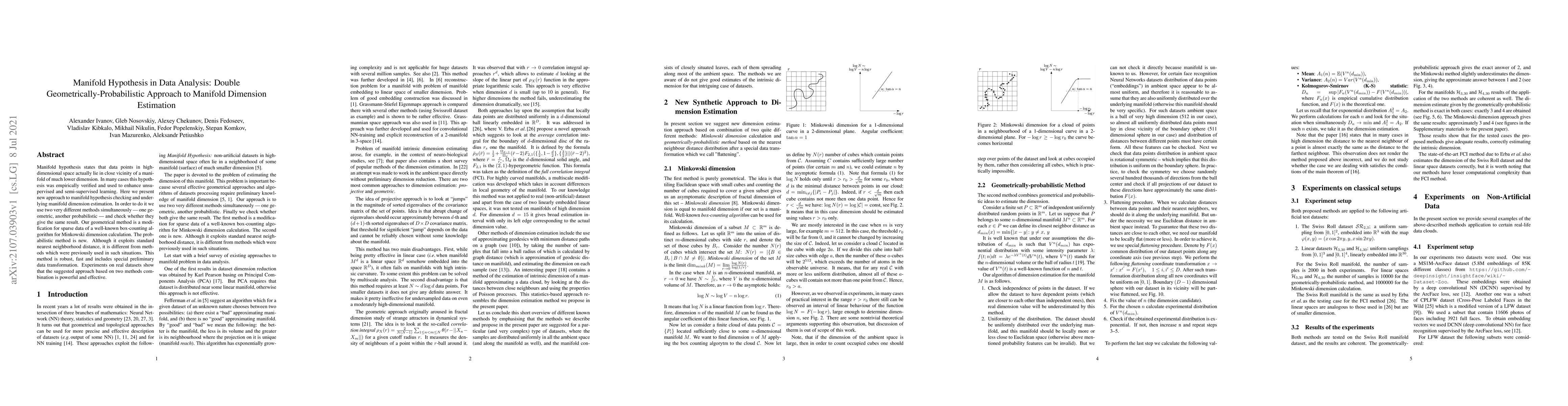 Manifold hypothesis states that data points in high-dimensional space actually lie in close vicinity of a manifold of much lower dimension. In many cases this hypothesis was empirically verified and used to enhance unsupervised and semi-supervised learning. Here we present new approach to manifold hypothesis checking and underlying manifold dimension estimation. In order to do it we use two very different methods simultaneously - one geometric, another probabilistic - and check whether they give the same result. Our geometrical method is a modification for sparse data of a well-known box-counting algorithm for Minkowski dimension calculation. The probabilistic method is new. Although it exploits standard nearest neighborhood distance, it is different from methods which were previously used in such situations. This method is robust, fast and includes special preliminary data transformation. Experiments on real datasets show that the suggested approach based on two methods combination is powerful and effective.