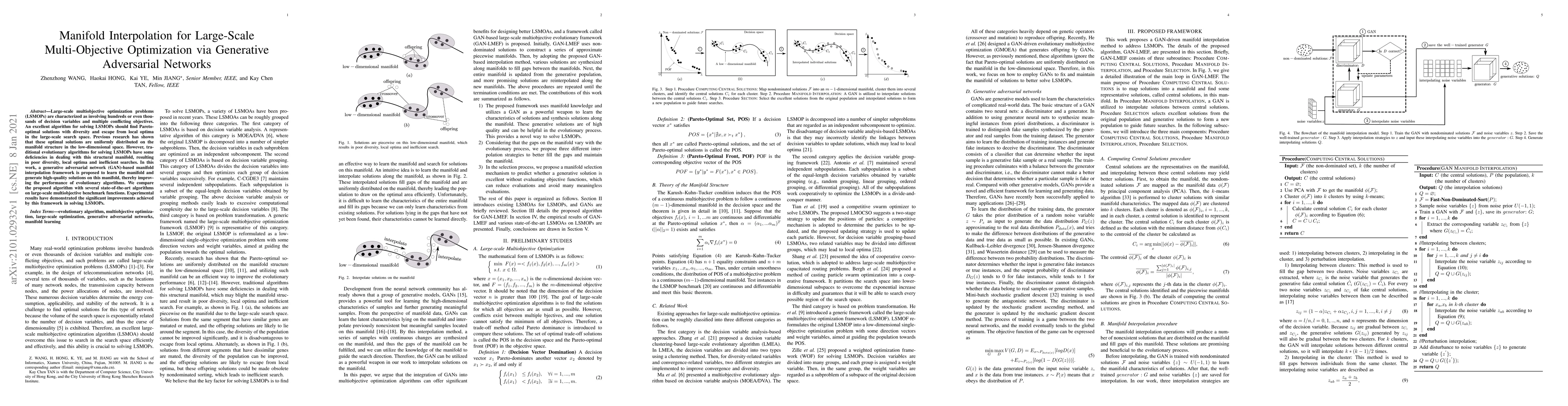This paper proposes a GAN-based manifold interpolation framework to enhance large-scale multi-objective optimization by learning the underlying manifold structure and generating diverse, high-quality solutions. Experimental results show significant improvements over state-of-the-art algorithms in solving large-scale multi-objective optimization problems.