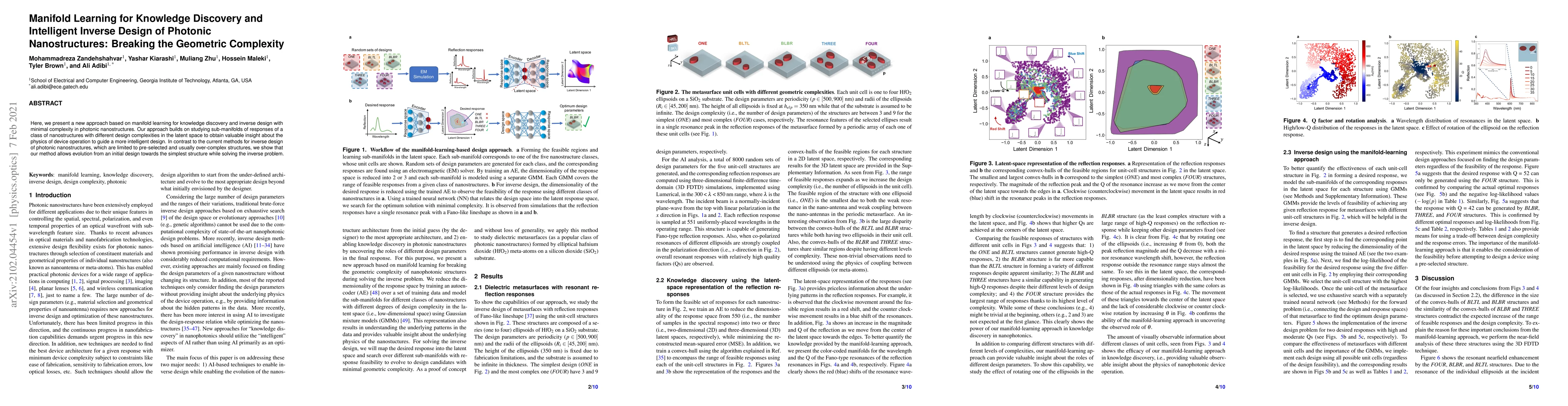 This paper introduces a manifold learning approach for discovering knowledge and designing simpler photonic nanostructures through intelligent inverse design, contrasting with current methods that rely on pre-selected, complex structures. The method evolves from an initial design to the simplest structure while solving the inverse problem.
