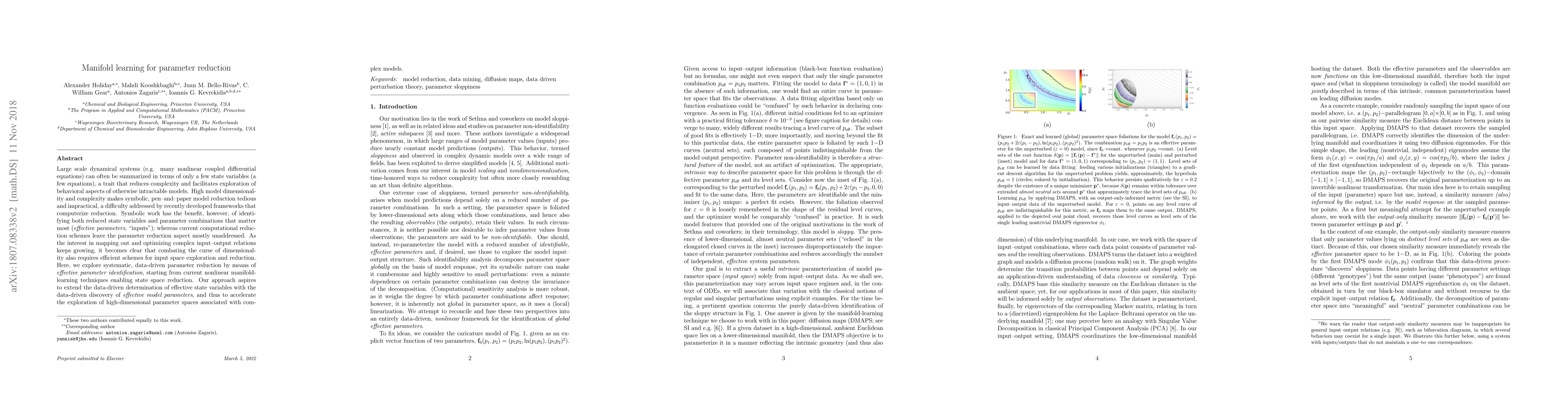 Large scale dynamical systems (e.g. many nonlinear coupled differential equations) can often be summarized in terms of only a few state variables (a few equations), a trait that reduces complexity and facilitates exploration of behavioral aspects of otherwise intractable models. High model dimensionality and complexity makes symbolic, pen--and--paper model reduction tedious and impractical, a difficulty addressed by recently developed frameworks that computerize reduction. Symbolic work has the benefit, however, of identifying both reduced state variables and parameter combinations that matter most (effective parameters, "inputs"); whereas current computational reduction schemes leave the parameter reduction aspect mostly unaddressed. As the interest in mapping out and optimizing complex input--output relations keeps growing, it becomes clear that combating the curse of dimensionality also requires efficient schemes for input space exploration and reduction. Here, we explore systematic, data-driven parameter reduction by means of effective parameter identification, starting from current nonlinear manifold-learning techniques enabling state space reduction. Our approach aspires to extend the data-driven determination of effective state variables with the data-driven discovery of effective model parameters, and thus to accelerate the exploration of high-dimensional parameter spaces associated with complex models.