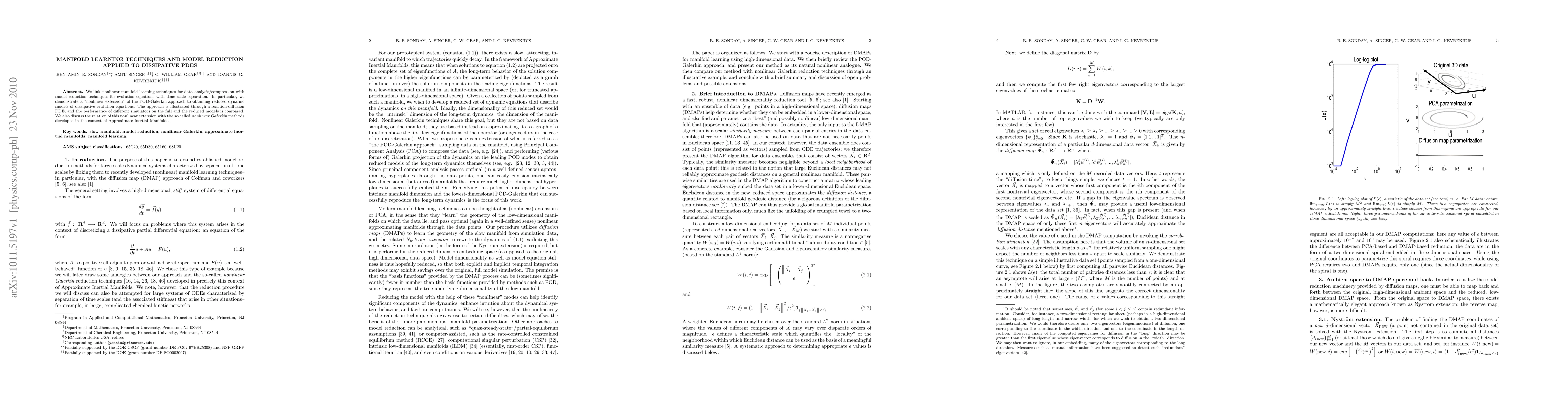 We link nonlinear manifold learning techniques for data analysis/compression with model reduction techniques for evolution equations with time scale separation. In particular, we demonstrate a `"nonlinear extension" of the POD-Galerkin approach to obtaining reduced dynamic models of dissipative evolution equations. The approach is illustrated through a reaction-diffusion PDE, and the performance of different simulators on the full and the reduced models is compared. We also discuss the relation of this nonlinear extension with the so-called "nonlinear Galerkin" methods developed in the context of Approximate Inertial Manifolds.