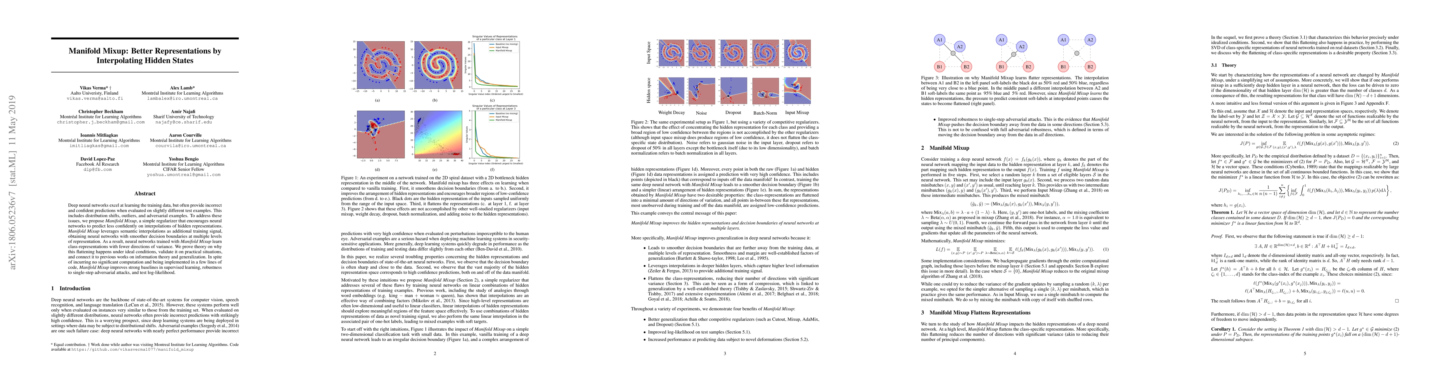 Deep neural networks excel at learning the training data, but often provide incorrect and confident predictions when evaluated on slightly different test examples. This includes distribution shifts, outliers, and adversarial examples. To address these issues, we propose Manifold Mixup, a simple regularizer that encourages neural networks to predict less confidently on interpolations of hidden representations. Manifold Mixup leverages semantic interpolations as additional training signal, obtaining neural networks with smoother decision boundaries at multiple levels of representation. As a result, neural networks trained with Manifold Mixup learn class-representations with fewer directions of variance. We prove theory on why this flattening happens under ideal conditions, validate it on practical situations, and connect it to previous works on information theory and generalization. In spite of incurring no significant computation and being implemented in a few lines of code, Manifold Mixup improves strong baselines in supervised learning, robustness to single-step adversarial attacks, and test log-likelihood.