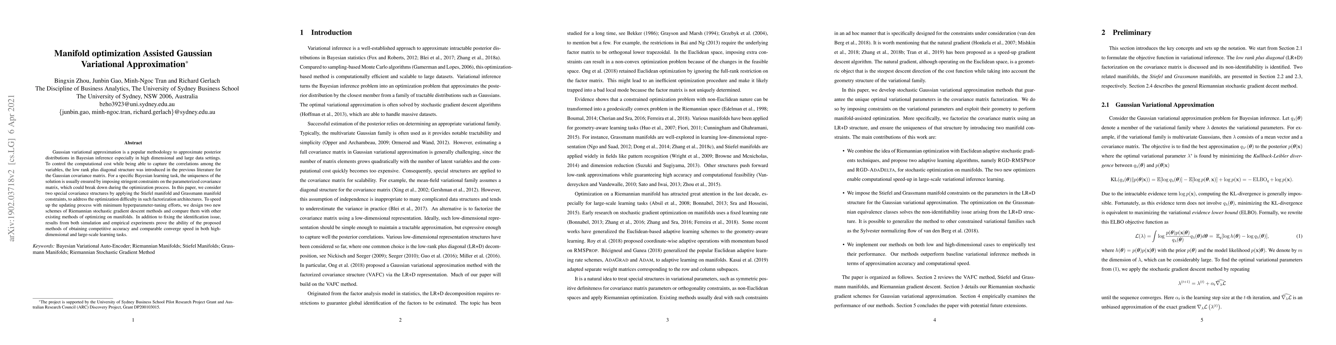 This paper proposes the use of Stiefel and Grassmann manifold constraints to optimize Gaussian variational approximations in high-dimensional Bayesian inference, introducing Riemannian stochastic gradient descent methods to achieve competitive accuracy and faster convergence with minimal hyperparameter tuning. Simulation and empirical results demonstrate the effectiveness of these methods in large-scale learning tasks.