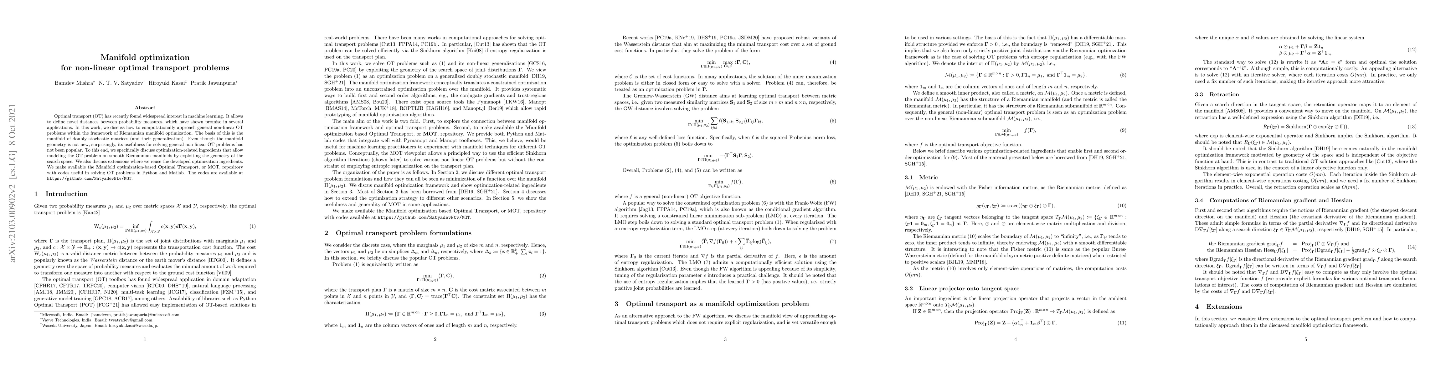 Optimal transport (OT) has recently found widespread interest in machine learning. It allows to define novel distances between probability measures, which have shown promise in several applications. In this work, we discuss how to computationally approach general non-linear OT problems within the framework of Riemannian manifold optimization. The basis of this is the manifold of doubly stochastic matrices (and their generalization). Even though the manifold geometry is not new, surprisingly, its usefulness for solving general non-linear OT problems has not been popular. To this end, we specifically discuss optimization-related ingredients that allow modeling the OT problem on smooth Riemannian manifolds by exploiting the geometry of the search space. We also discuss extensions where we reuse the developed optimization ingredients. We make available the Manifold optimization-based Optimal Transport, or MOT, repository with codes useful in solving OT problems in Python and Matlab. The codes are available at \url{https://github.com/SatyadevNtv/MOT}.