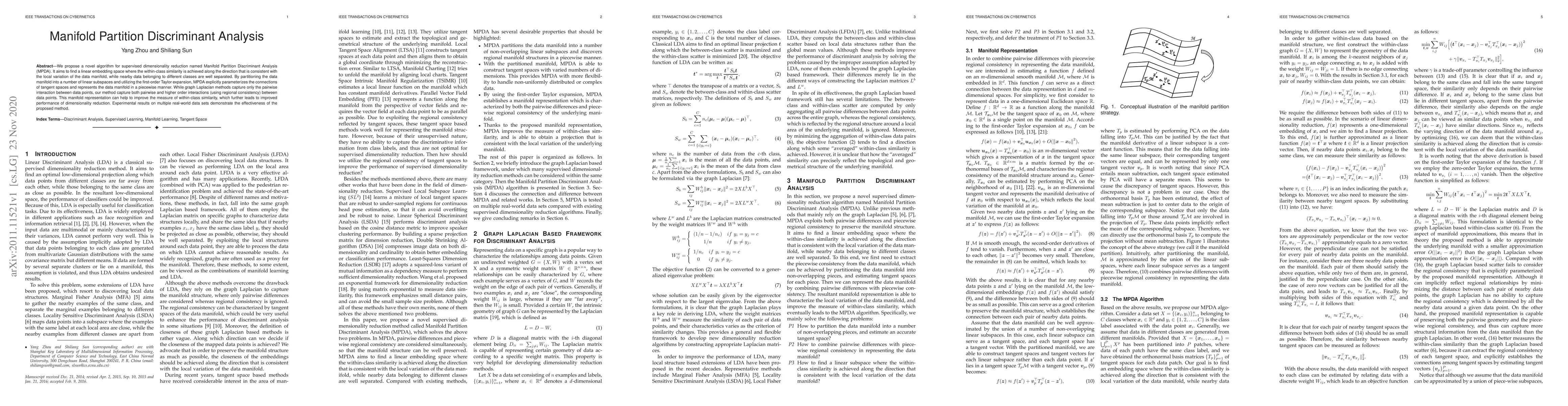 Manifold Partition Discriminant Analysis (MPDA) is a novel algorithm that reduces dimensionality while preserving within-class similarity and separating data points across different classes. Experimental results show its effectiveness on multiple real-world datasets.