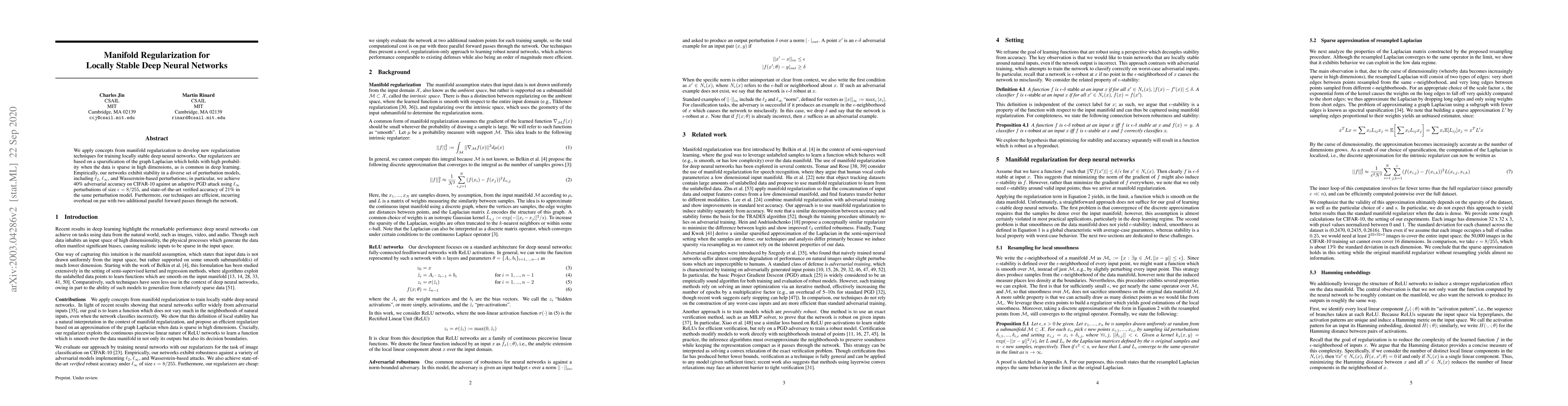 This paper introduces manifold regularization techniques to enhance the local stability of deep neural networks, achieving notable adversarial accuracy improvements on CIFAR-10 against various perturbation models and maintaining computational efficiency.