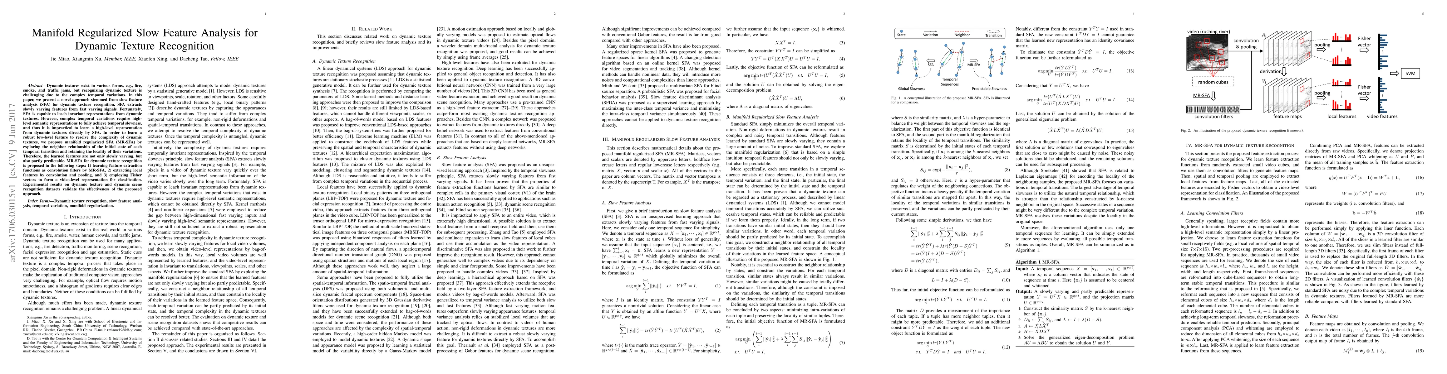 This paper introduces manifold regularized slow feature analysis (MR-SFA) for dynamic texture recognition, enhancing SFA by incorporating neighbor relationships to extract robust, slowly varying, and partly predictable features. The proposed method includes learning convolution filters, local feature extraction, and forming a video-level representation via Fisher vectors for classification, demonstrating effectiveness on dynamic texture datasets.
