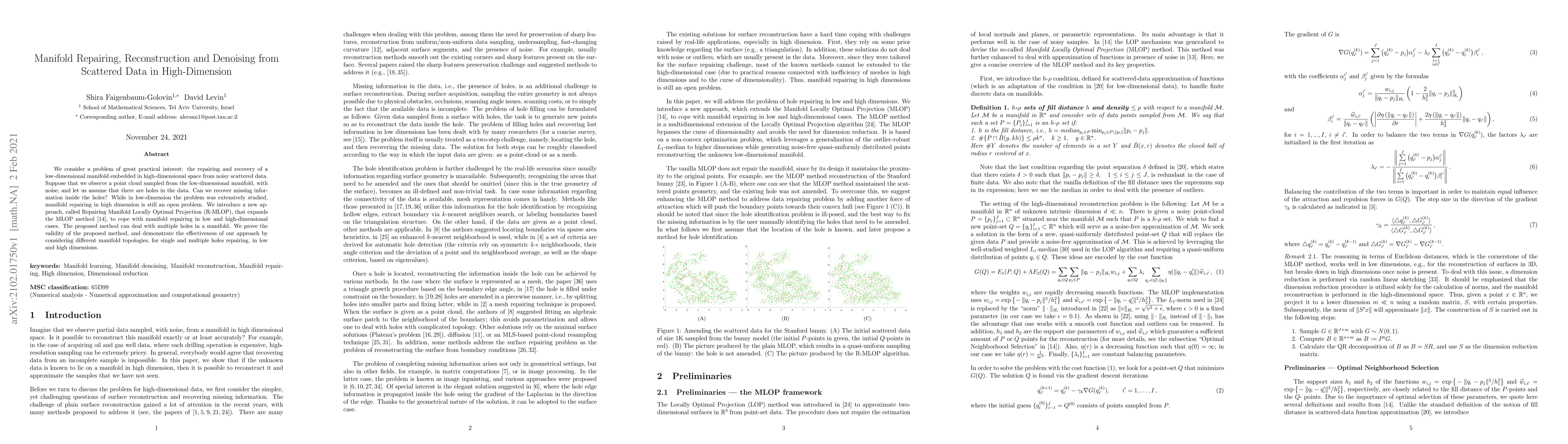This paper introduces a new method called Repairing Manifold Locally Optimal Projection (R-MLOP) to repair and reconstruct low-dimensional manifolds from noisy, scattered high-dimensional data, including scenarios with multiple holes. The method extends the MLOP approach to handle both low and high-dimensional cases effectively.
