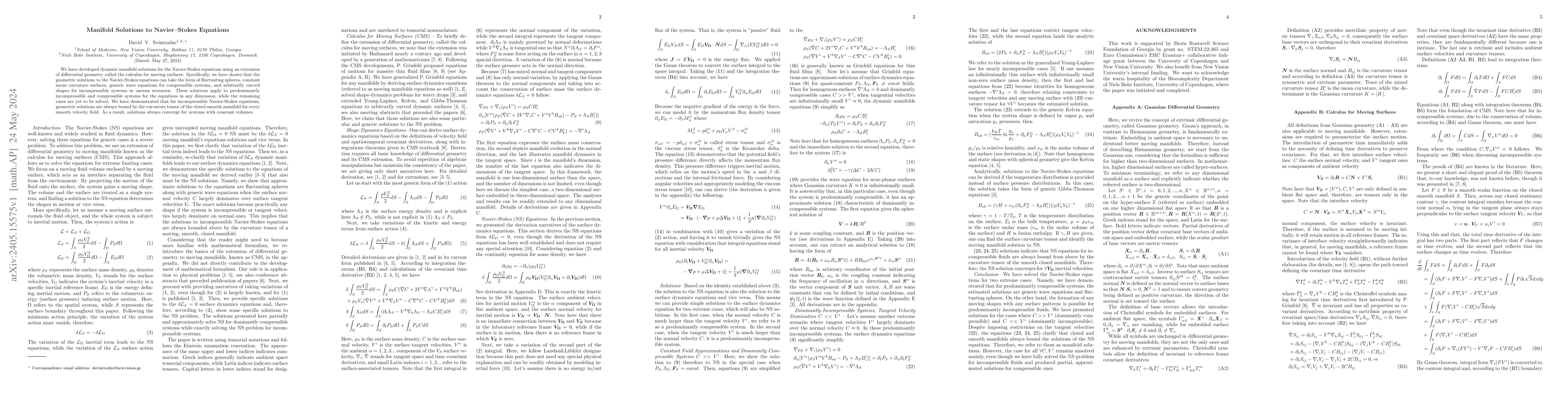 We have developed dynamic manifold solutions for the Navier-Stokes equations using an extension of differential geometry called the calculus for moving surfaces. Specifically, we have shown that the geometric solutions to the Navier-Stokes equations can take the form of fluctuating spheres, constant mean curvature surfaces, generic wave equations for compressible systems, and arbitrarily curved shapes for incompressible systems in various scenarios. These solutions apply to predominantly incompressible and compressible systems for the equations in any dimension, while the remaining cases are yet to be solved. We have demonstrated that for incompressible Navier-Stokes equations, geometric solutions are always bound by the curvature tensor of the closed smooth manifold for every smooth velocity field. As a result, solutions always converge for systems with constant volumes.