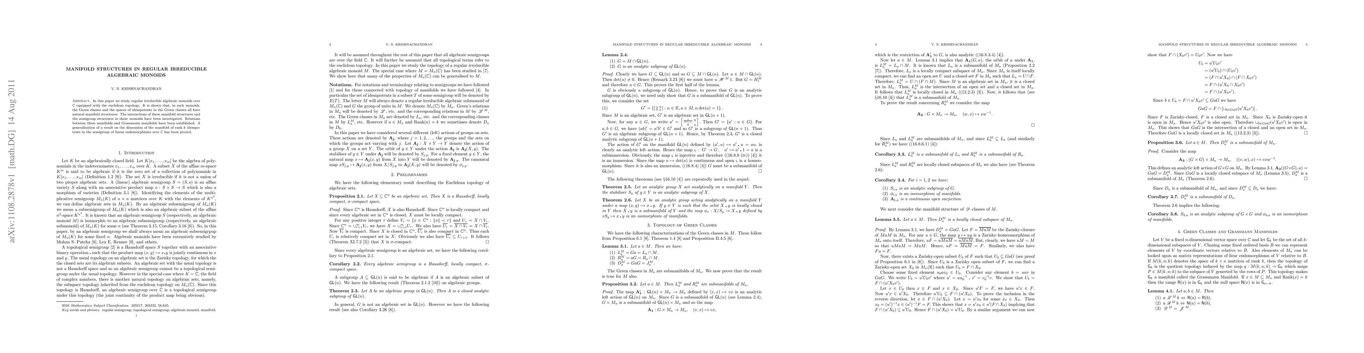 In this paper we study regular irreducible algebraic monoids over $\fldc$ equipped with the euclidean topology. It is shown that, in such monoids, the Green classes and the spaces of idempotents in the Green classes all have natural manifold structures. The interactions of these manifold structures and the semigroup structures in these monoids have been investigated. Relations between these manifolds and Grassmann manifolds have been established. A generalisation of a result on the dimension of the manifold of rank $k$ idempotents in the semigroup of linear endomorphisms over $\fldc$ has been proved.