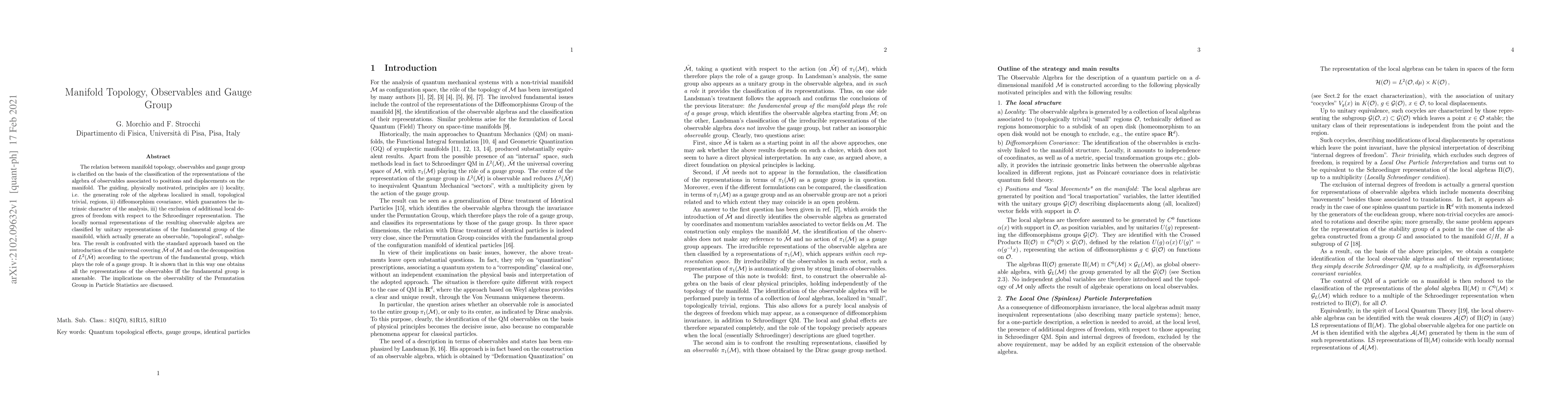 The relation between manifold topology, observables and gauge group is clarified on the basis of the classification of the representations of the algebra of observables associated to positions and displacements on the manifold. The guiding, physically motivated, principles are i) locality, i.e. the generating role of the algebras localized in small, topological trivial, regions, ii) diffeomorphism covariance, which guarantees the intrinsic character of the analysis, iii) the exclusion of additional local degrees of freedom with respect to the Schroedinger representation. The locally normal representations of the resulting observable algebra are classified by unitary representations of the fundamental group of the manifold, which actually generate an observable, "topological", subalgebra. The result is confronted with the standard approach based on the introduction of the universal covering ${\tilde{\cal M}}$ of $\cal{M}$ and on the decomposition of $L^2({\tilde{\cal M}})$ according to the spectrum of the fundamental group, which plays the role of a gauge group. It is shown that in this way one obtains all the representations of the observables iff the fundamental group is amenable. The implications on the observability of the Permutation Group in Particle Statistics are discussed.