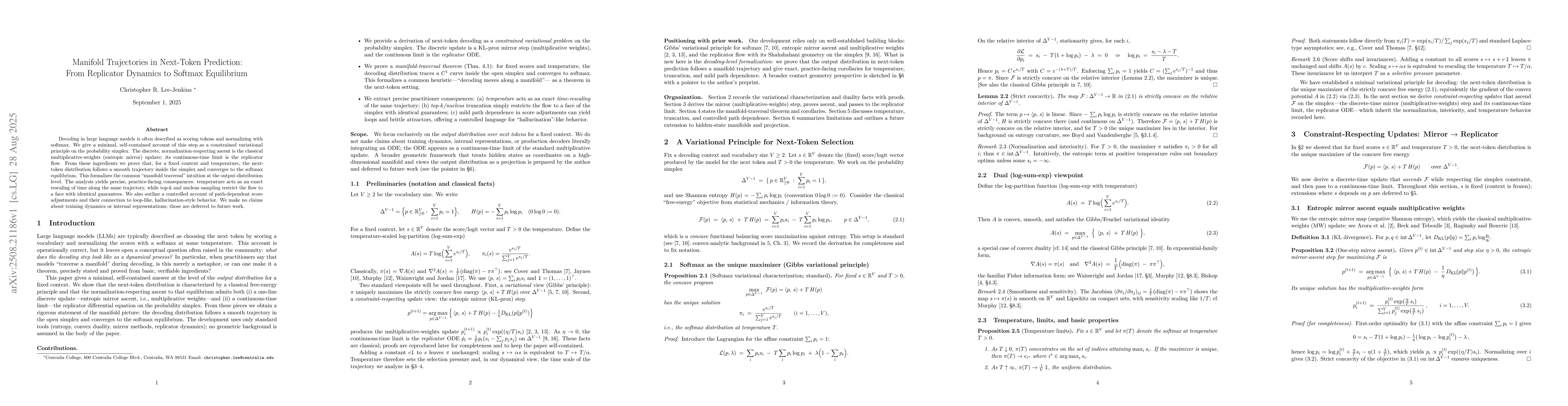 Decoding in large language models is often described as scoring tokens and normalizing with softmax. We give a minimal, self-contained account of this step as a constrained variational principle on the probability simplex. The discrete, normalization-respecting ascent is the classical multiplicative-weights (entropic mirror) update; its continuous-time limit is the replicator flow. From these ingredients we prove that, for a fixed context and temperature, the next-token distribution follows a smooth trajectory inside the simplex and converges to the softmax equilibrium. This formalizes the common ``manifold traversal'' intuition at the output-distribution level. The analysis yields precise, practice-facing consequences: temperature acts as an exact rescaling of time along the same trajectory, while top-k and nucleus sampling restrict the flow to a face with identical guarantees. We also outline a controlled account of path-dependent score adjustments and their connection to loop-like, hallucination-style behavior. We make no claims about training dynamics or internal representations; those are deferred to future work.