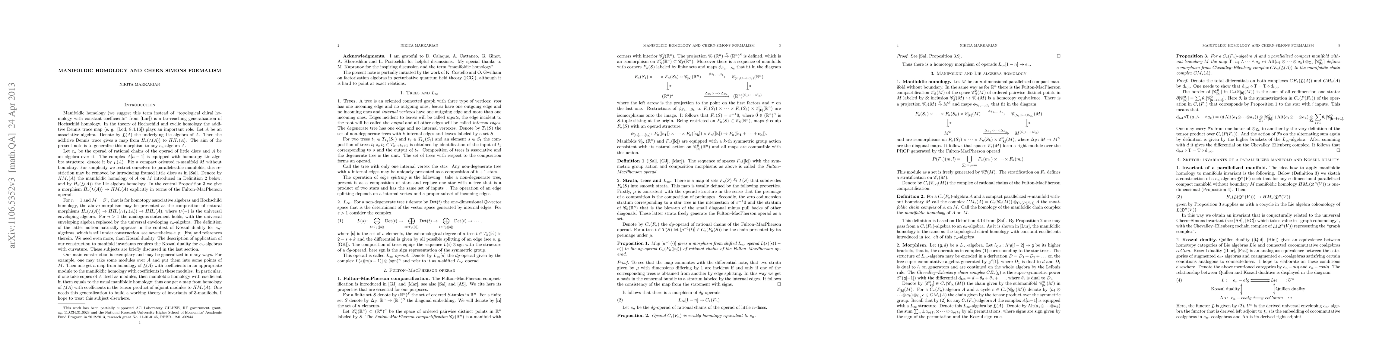 This paper defines a morphism from the homology of a homotopy Lie algebra to the topological chiral homology of a compact parallelizable manifold, crucial for the perturbative Chern-Simons theory. The construction is applied to $e_n$-algebras and n-manifolds without borders.