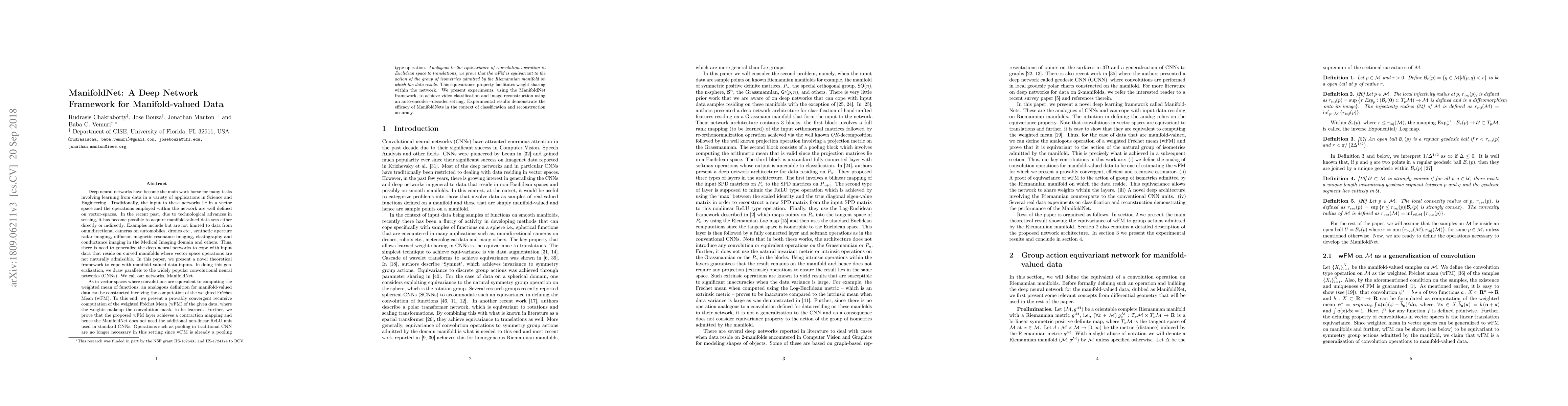 This paper introduces ManifoldNet, a novel deep network framework for processing manifold-valued data, generalizing convolutional neural networks (CNNs) to curved manifolds. It employs a weighted Fréchet Mean layer for convolution, achieving contraction mapping without requiring ReLU units, and demonstrates its effectiveness through classification and reconstruction tasks.