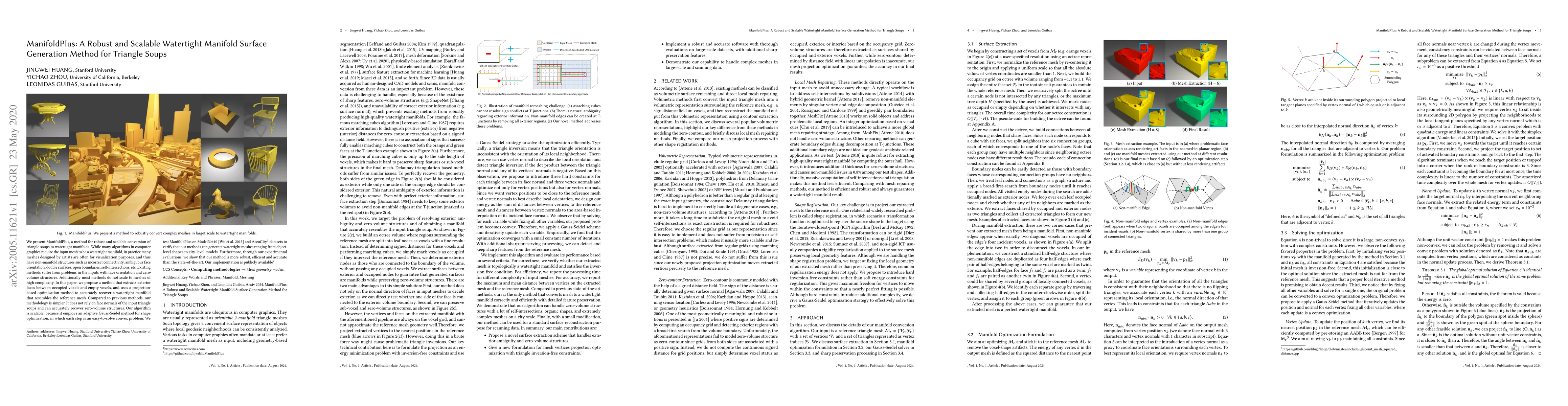 ManifoldPlus presents a scalable method for converting triangle soups into watertight manifolds, addressing issues like incorrect connectivity and self-intersections. It leverages voxel-based extraction and projection optimization, proving more robust, efficient, and accurate than existing methods.