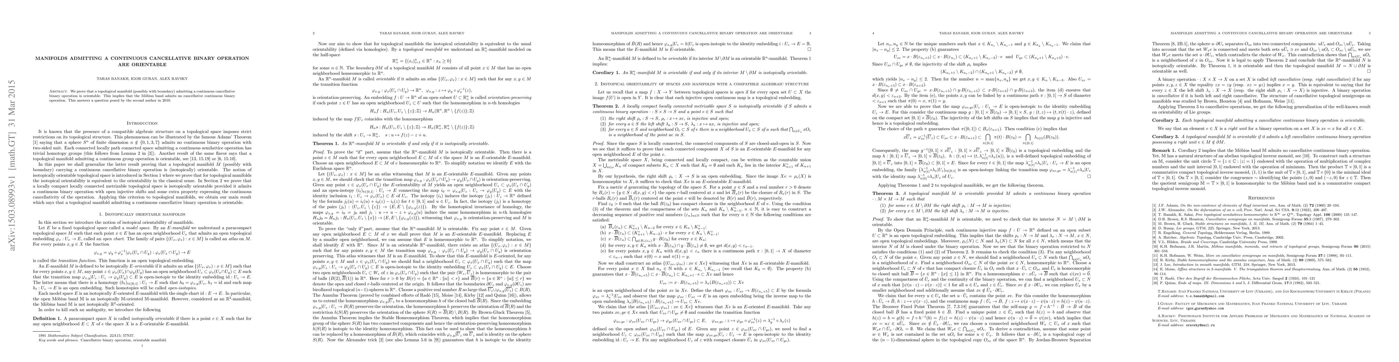 We prove that a topological manifold (possibly with boundary) admitting a continuous cancellative binary operation is orientable. This implies that the M\"obius band admits no cancellative continuous binary operation. This answers a question posed by the second author in 2010.