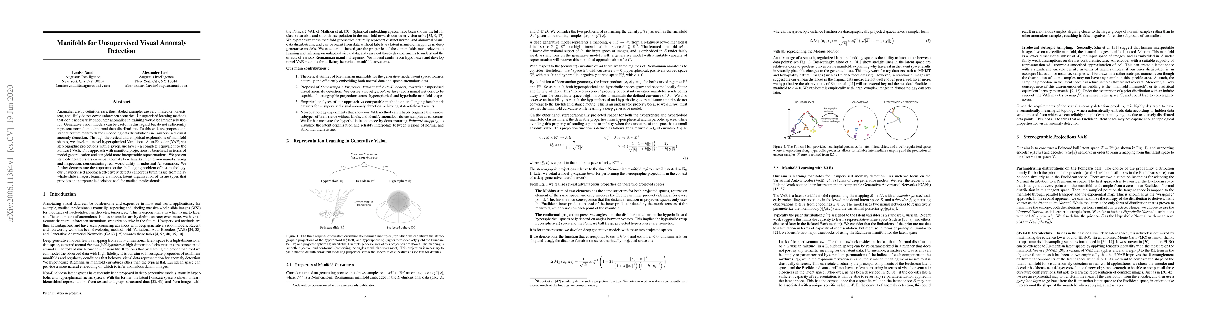Anomalies are by definition rare, thus labeled examples are very limited or nonexistent, and likely do not cover unforeseen scenarios. Unsupervised learning methods that don't necessarily encounter anomalies in training would be immensely useful. Generative vision models can be useful in this regard but do not sufficiently represent normal and abnormal data distributions. To this end, we propose constant curvature manifolds for embedding data distributions in unsupervised visual anomaly detection. Through theoretical and empirical explorations of manifold shapes, we develop a novel hyperspherical Variational Auto-Encoder (VAE) via stereographic projections with a gyroplane layer - a complete equivalent to the Poincar\'e VAE. This approach with manifold projections is beneficial in terms of model generalization and can yield more interpretable representations. We present state-of-the-art results on visual anomaly benchmarks in precision manufacturing and inspection, demonstrating real-world utility in industrial AI scenarios. We further demonstrate the approach on the challenging problem of histopathology: our unsupervised approach effectively detects cancerous brain tissue from noisy whole-slide images, learning a smooth, latent organization of tissue types that provides an interpretable decisions tool for medical professionals.
