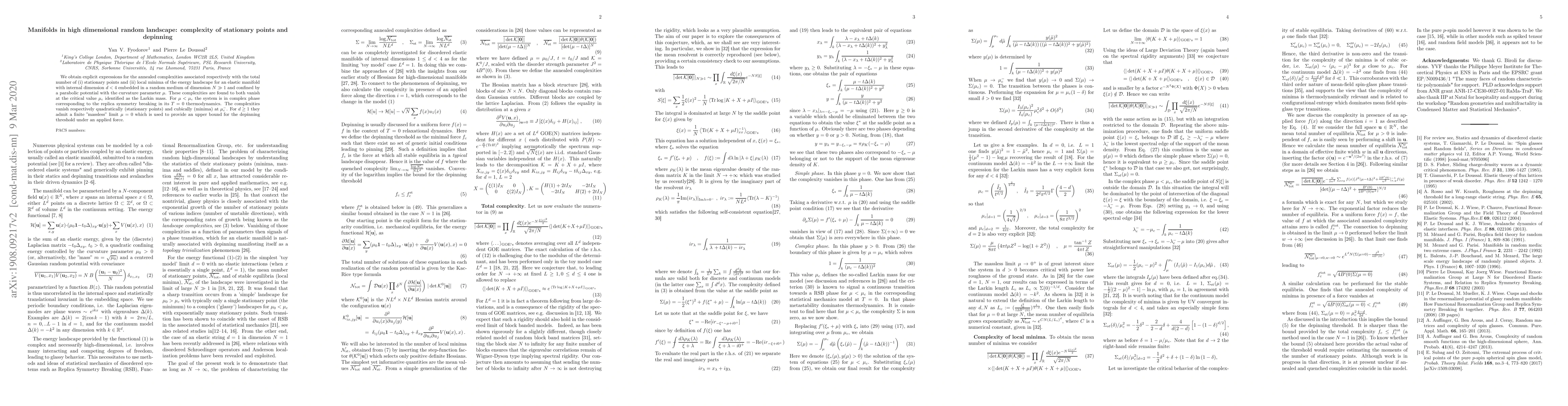 Researchers studied a high-dimensional random landscape with an elastic manifold in a random medium under parabolic confinement. They found that the number of stationary points and local minima vanishes at a critical value related to the Larkin mass.