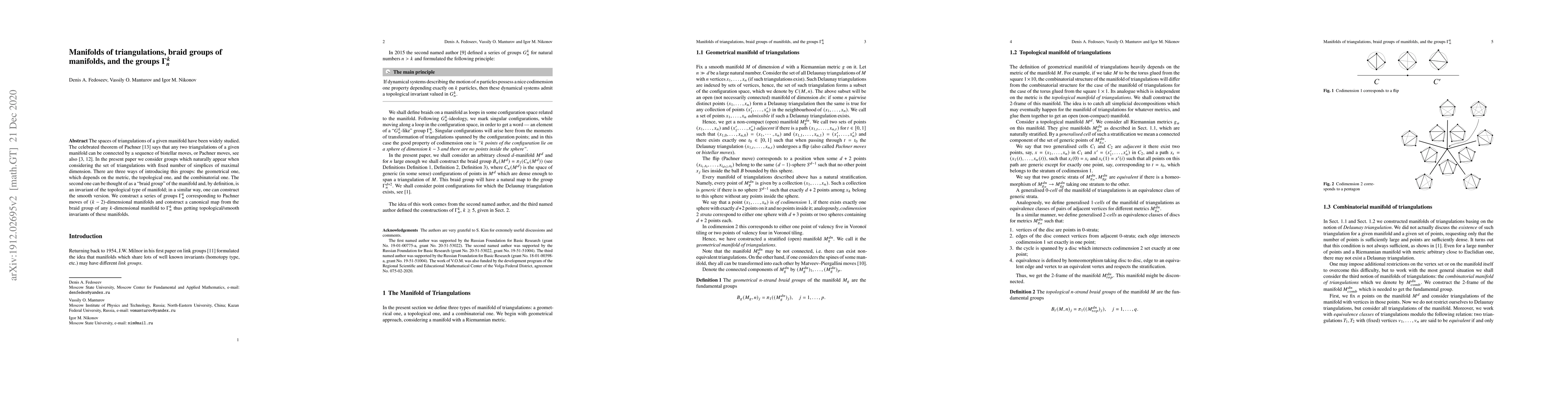This paper explores the groups $\Gamma_{n}^{k}$ that arise from triangulations of $(k-2)$-dimensional manifolds, establishing connections between geometric, topological, and combinatorial perspectives. It constructs a canonical map from the braid group of a manifold to $\Gamma_{n}^{k}$, providing topological/smooth invariants for these manifolds.