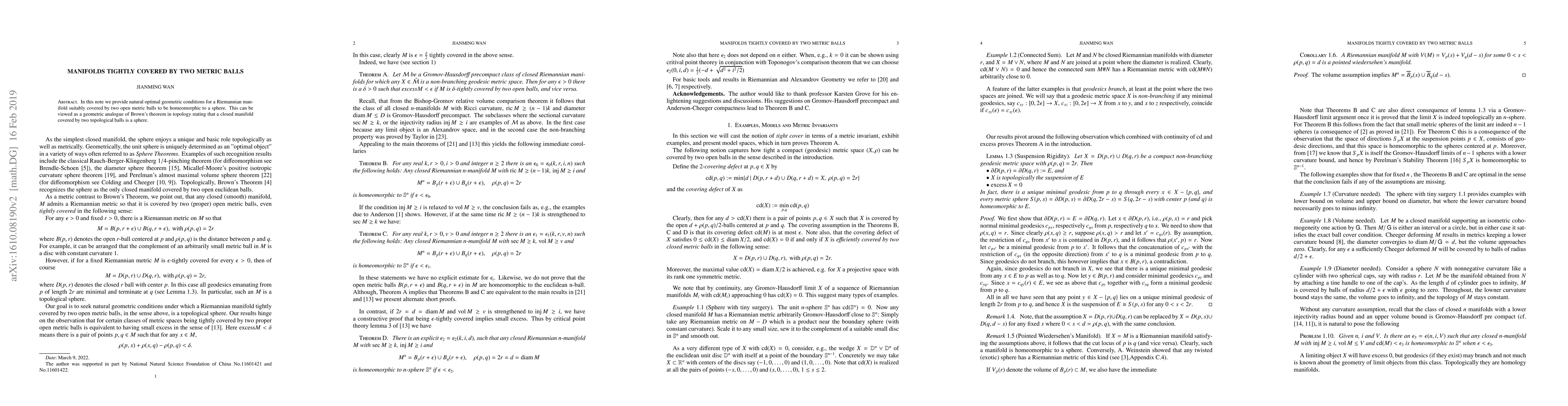 Researchers found natural conditions for a Riemannian manifold covered by two metric balls to be homeomorphic to a sphere, analogous to Brown's theorem in topology.