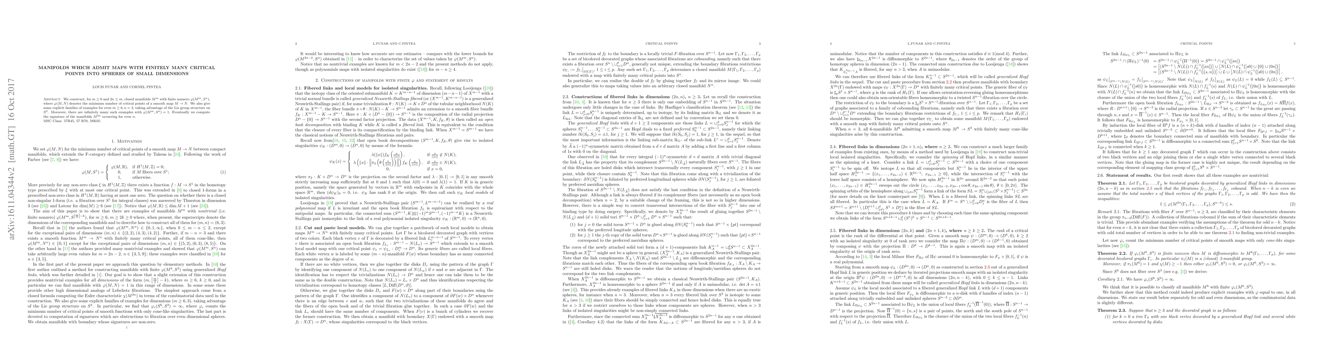 We construct, for $m\geq 6$ and $2n\leq m$, closed manifolds $M^{m}$ with finite nonzero $\varphi(M^{m},S^{n}$), where $\varphi(M,N)$ denotes the minimum number of critical points of a smooth map $M\to N$. We also give some explicit families of examples for even $m\geq 6, n=3$, taking advantage of the Lie group structure on $S^3$. Moreover, there are infinitely many such examples with $\varphi(M^{m},S^{n})=1$. Eventually we compute the signature of the manifolds $M^{2n}$ occurring for even $n$.