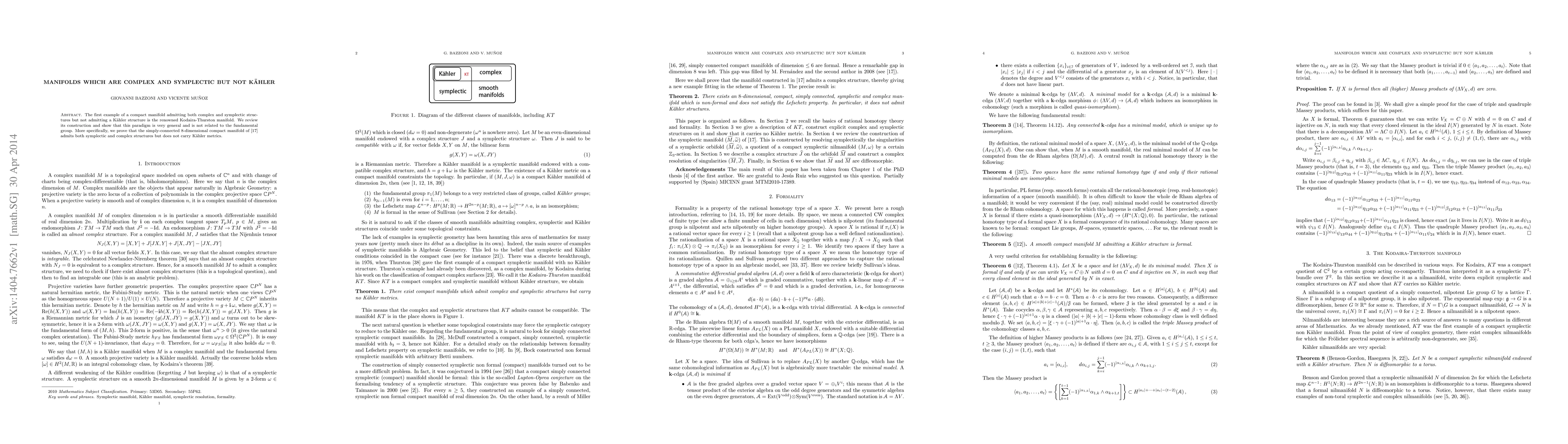 The first example of a compact manifold admitting both complex and symplectic structures but not admitting a K\"ahler structure is the renowned Kodaira-Thurston manifold. We review its construction and show that this paradigm is very general and is not related to the fundamental group. More specifically, we prove that the simply-connected $8$-dimensional compact manifold of [\textsc{M. Fern\'{a}ndez and V. Mu\~{n}oz}, \emph{An 8-dimensional non-formal simply connected symplectic manifold}, Ann. of Math. (2) \textbf{167}, no. 3, 1045--1054, 2008.] admits both symplectic and complex structures but does not carry K\"ahler metrics.