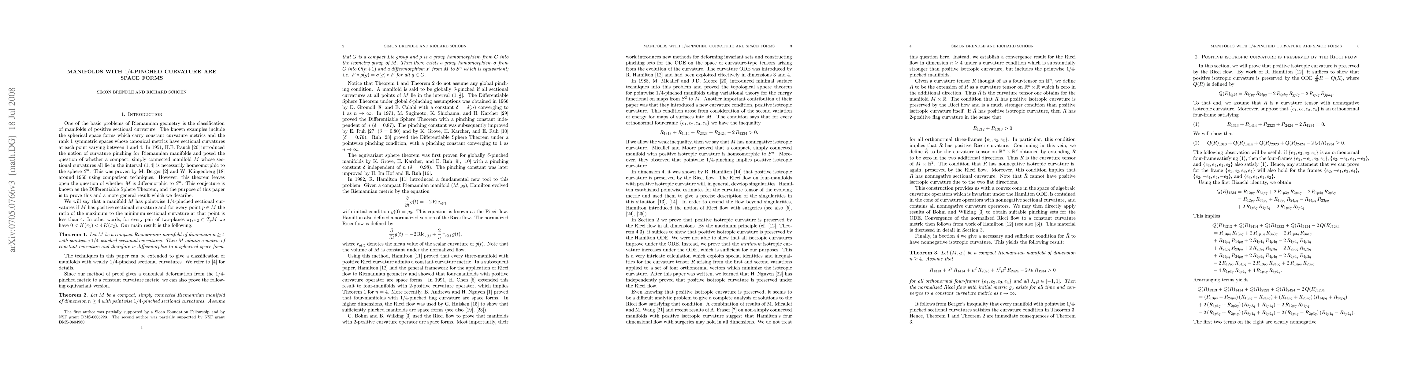 This paper demonstrates that a compact Riemannian manifold with 1/4-pinched sectional curvatures can be transformed via Ricci flow into a constant curvature metric. The proof leverages the preservation of positive isotropic curvature by Ricci flow and builds on prior work by Hamilton and Bohm-Wilking.