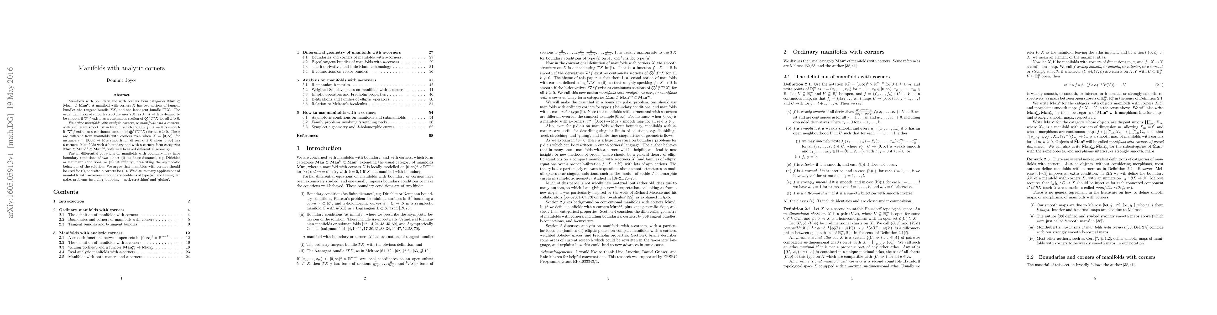 This paper introduces the concept of "manifolds with analytic corners" or "a-corners," which differ from standard manifolds with corners in their definition of smoothness using the b-tangent bundle. It discusses the use of these manifolds in differential geometry and partial differential equations, suggesting that they are particularly suited for boundary conditions at infinity and for handling singular phenomena like bubbling, neck-stretching, and gluing.