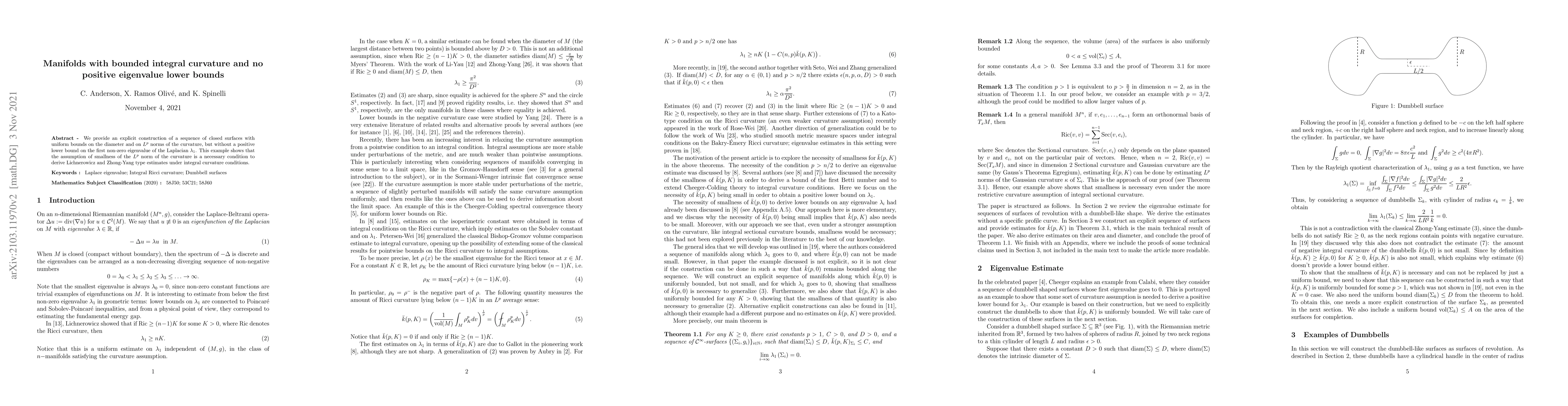 The paper presents a construction of closed surface examples with controlled diameter and curvature $L^p$ norms, yet lacking a positive lower bound on the first non-zero Laplacian eigenvalue. This demonstrates that curvature $L^p$ norm smallness is crucial for deriving Lichnerowicz and Zhong-Yang estimates under integral curvature conditions.