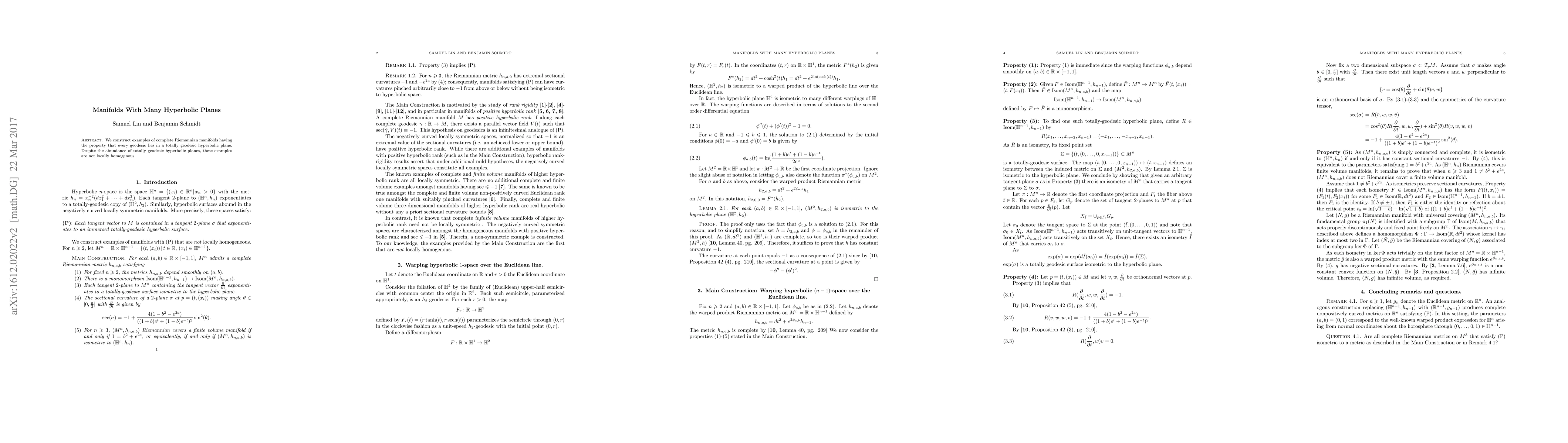 We construct examples of complete Riemannian manifolds having the property that every geodesic lies in a totally geodesic hyperbolic plane. Despite the abundance of totally geodesic hyperbolic planes, these examples are not locally homogenous.