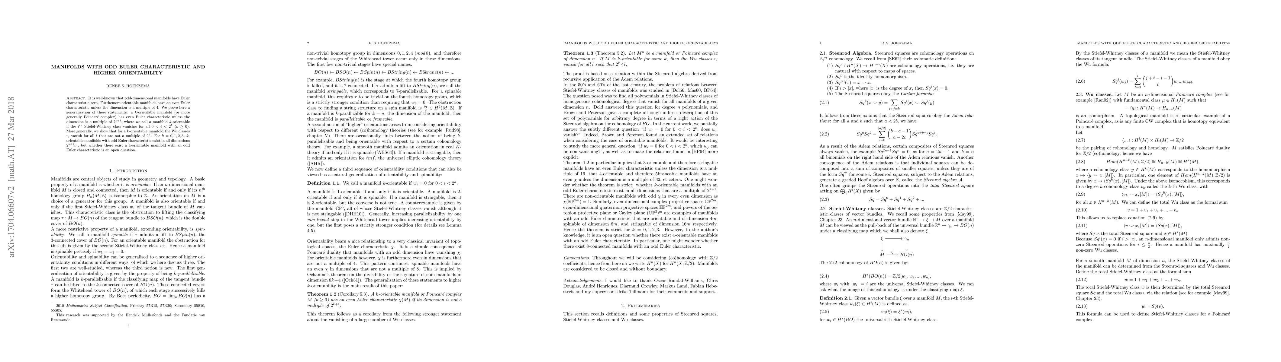 This paper generalizes the Euler characteristic properties of manifolds, showing that $k$-orientable manifolds have an even Euler characteristic unless their dimension is a multiple of $2^{k+1}$. It also explores the conditions under which the Wu classes vanish for $l$ that are multiples of $2^k$.