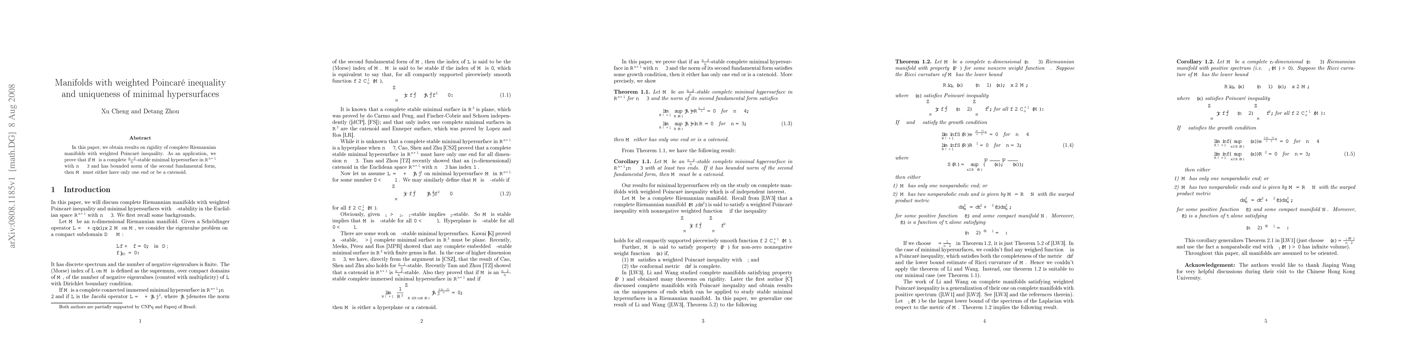 This paper establishes rigidity results for complete Riemannian manifolds satisfying a weighted Poincaré inequality, and demonstrates that a complete $\frac{n-2}{n}$-stable minimal hypersurface in $\mathbb{R}^{n+1}$ with bounded second fundamental form norm is either unique or a catenoid.