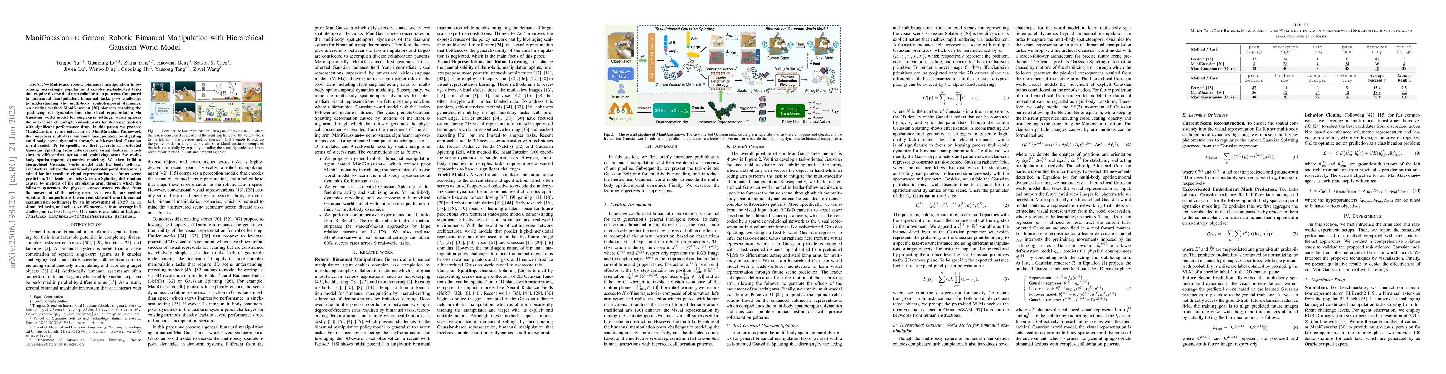 Multi-task robotic bimanual manipulation is becoming increasingly popular as it enables sophisticated tasks that require diverse dual-arm collaboration patterns. Compared to unimanual manipulation, bimanual tasks pose challenges to understanding the multi-body spatiotemporal dynamics. An existing method ManiGaussian pioneers encoding the spatiotemporal dynamics into the visual representation via Gaussian world model for single-arm settings, which ignores the interaction of multiple embodiments for dual-arm systems with significant performance drop. In this paper, we propose ManiGaussian++, an extension of ManiGaussian framework that improves multi-task bimanual manipulation by digesting multi-body scene dynamics through a hierarchical Gaussian world model. To be specific, we first generate task-oriented Gaussian Splatting from intermediate visual features, which aims to differentiate acting and stabilizing arms for multi-body spatiotemporal dynamics modeling. We then build a hierarchical Gaussian world model with the leader-follower architecture, where the multi-body spatiotemporal dynamics is mined for intermediate visual representation via future scene prediction. The leader predicts Gaussian Splatting deformation caused by motions of the stabilizing arm, through which the follower generates the physical consequences resulted from the movement of the acting arm. As a result, our method significantly outperforms the current state-of-the-art bimanual manipulation techniques by an improvement of 20.2% in 10 simulated tasks, and achieves 60% success rate on average in 9 challenging real-world tasks. Our code is available at https://github.com/April-Yz/ManiGaussian_Bimanual.