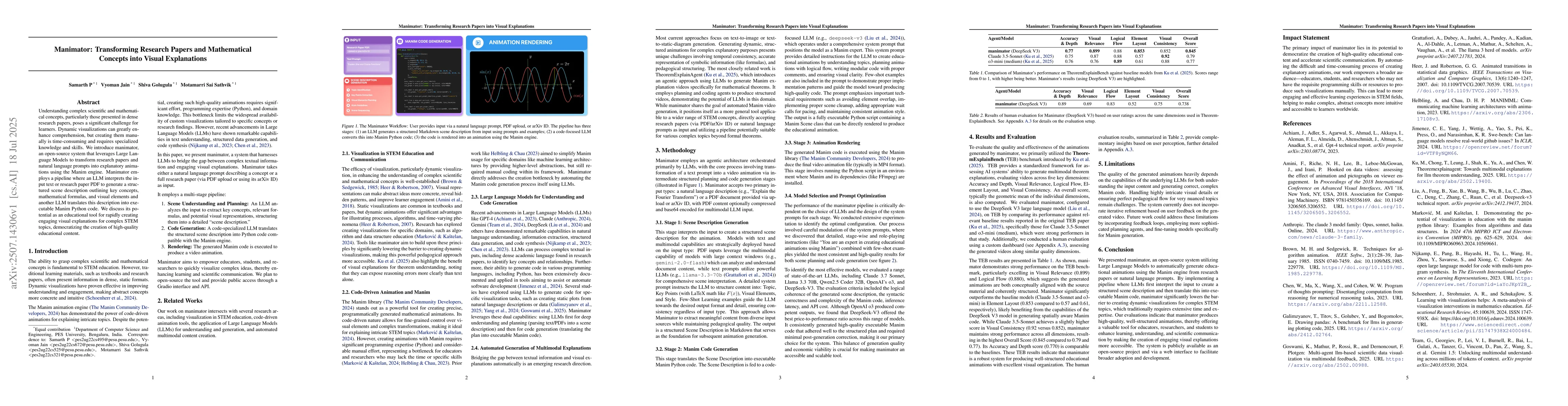 Understanding complex scientific and mathematical concepts, particularly those presented in dense research papers, poses a significant challenge for learners. Dynamic visualizations can greatly enhance comprehension, but creating them manually is time-consuming and requires specialized knowledge and skills. We introduce manimator, an open-source system that leverages Large Language Models to transform research papers and natural language prompts into explanatory animations using the Manim engine. Manimator employs a pipeline where an LLM interprets the input text or research paper PDF to generate a structured scene description outlining key concepts, mathematical formulas, and visual elements and another LLM translates this description into executable Manim Python code. We discuss its potential as an educational tool for rapidly creating engaging visual explanations for complex STEM topics, democratizing the creation of high-quality educational content.