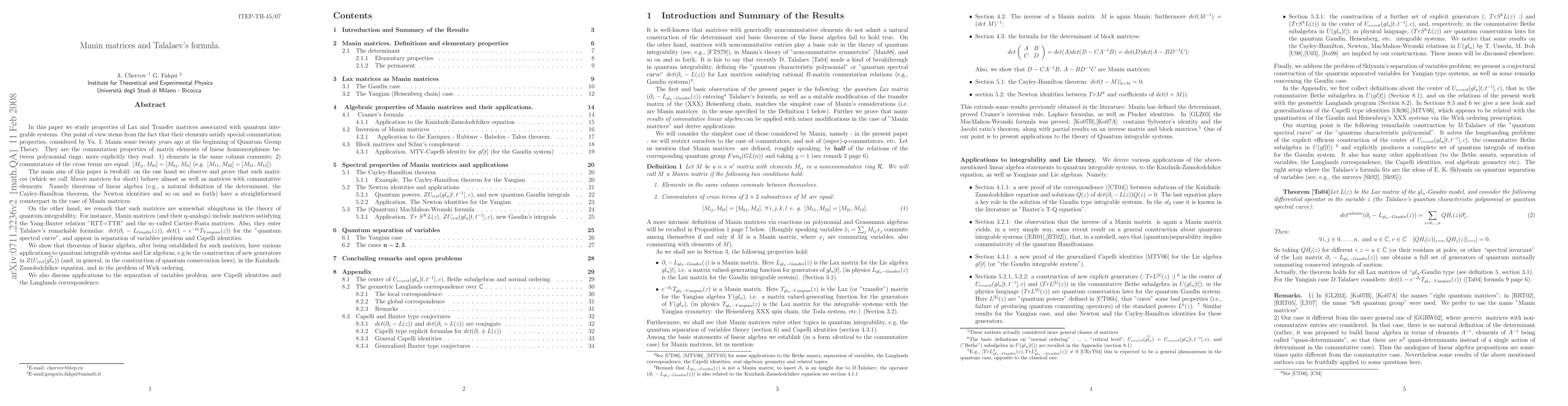 The novelty of this work lies in its exploration of Manin matrices and their applications in integrable systems theory. By showing that key linear algebra theorems hold for these noncommutative matrices, the paper opens new avenues for applying classical algebraic techniques to quantum systems, which have traditionally been approached using more specialized methods.