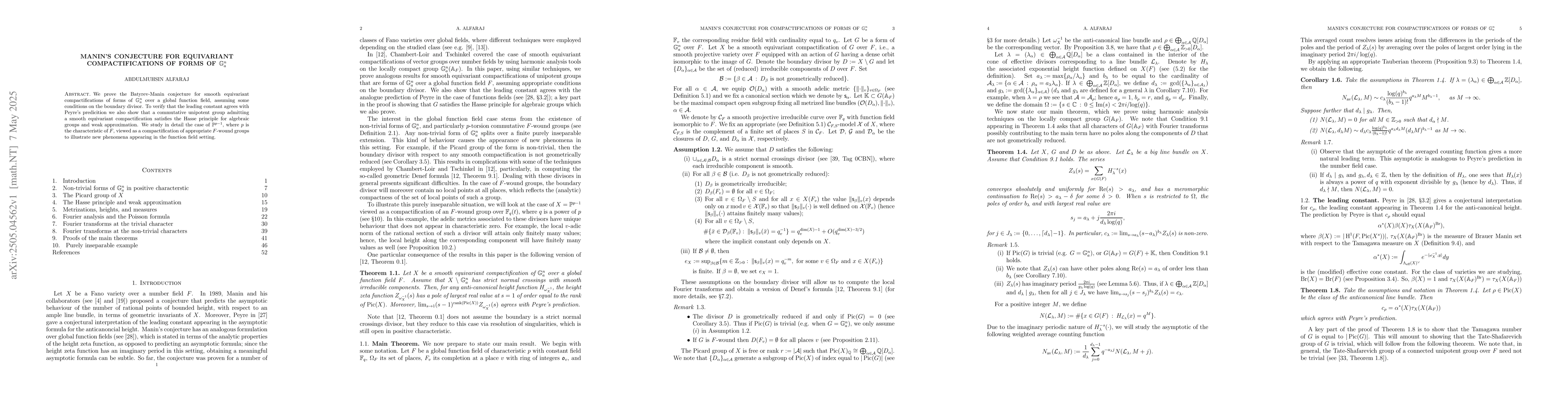 The paper proves Manin's Conjecture for smooth equivariant compactifications of forms of $oldsymbol{oldsymbol{oldsymbol{oldsymbol{oldsymbol{G}}_a^n}}}$ over a global function field $F$, with implications for algebraic groups and weak approximation in characteristic $p$.